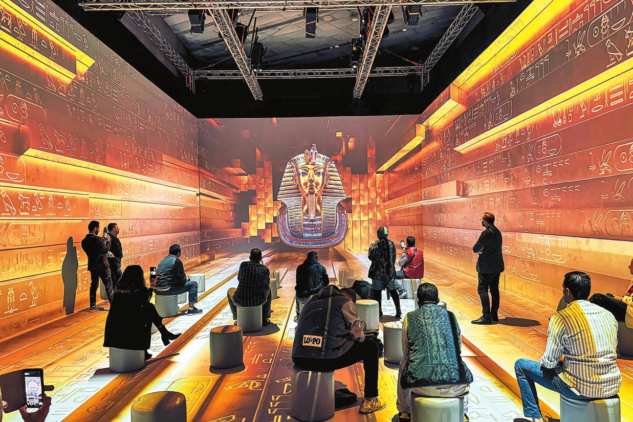 11月20日,图坦卡蒙沉浸式展览在大埃及博物馆开幕。观众可通过现场绚丽的视觉效果和配乐沉浸式了解法老图坦卡蒙的故事,以及古埃及的历史文化。图为11月20日,人们在埃及吉萨的大埃及博物馆参观图坦卡蒙沉浸式展览。