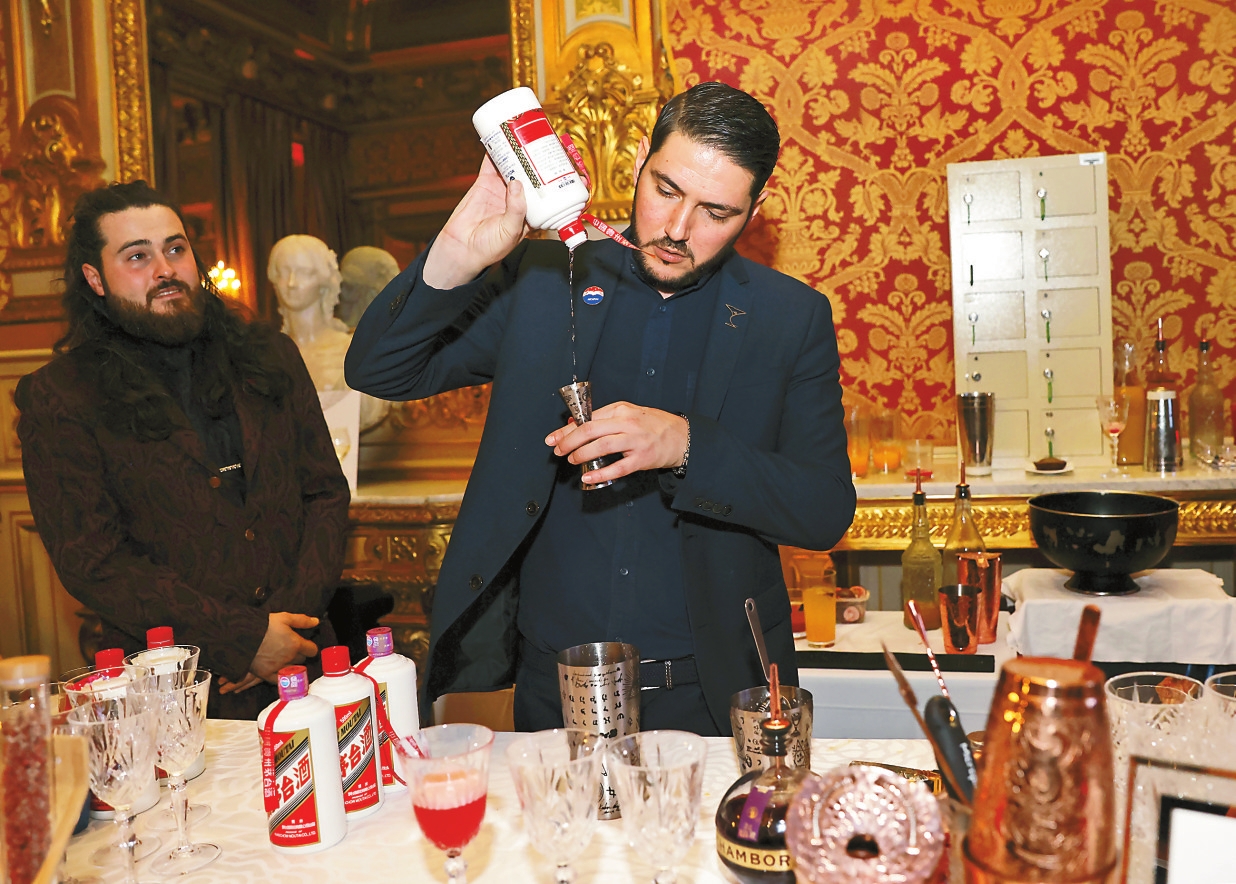 法国LA LISTE国际美食2024年排行榜20日在位于巴黎的法国外交部举行揭榜仪式。来自法国、中国、西班牙、韩国等国的餐馆展示其独家美食。LA LISTE国际美食榜单于2015年由法国人首创,如今已收录来自全球200个国家和地区的2万多家餐厅,参考800多个专业美食指南和民众在线点评,得分靠前的1000家餐厅进入下一年度全球美食排行榜。图为11月20日,活动现场调酒师制作茅台鸡尾酒。 新华社记者 高静 摄