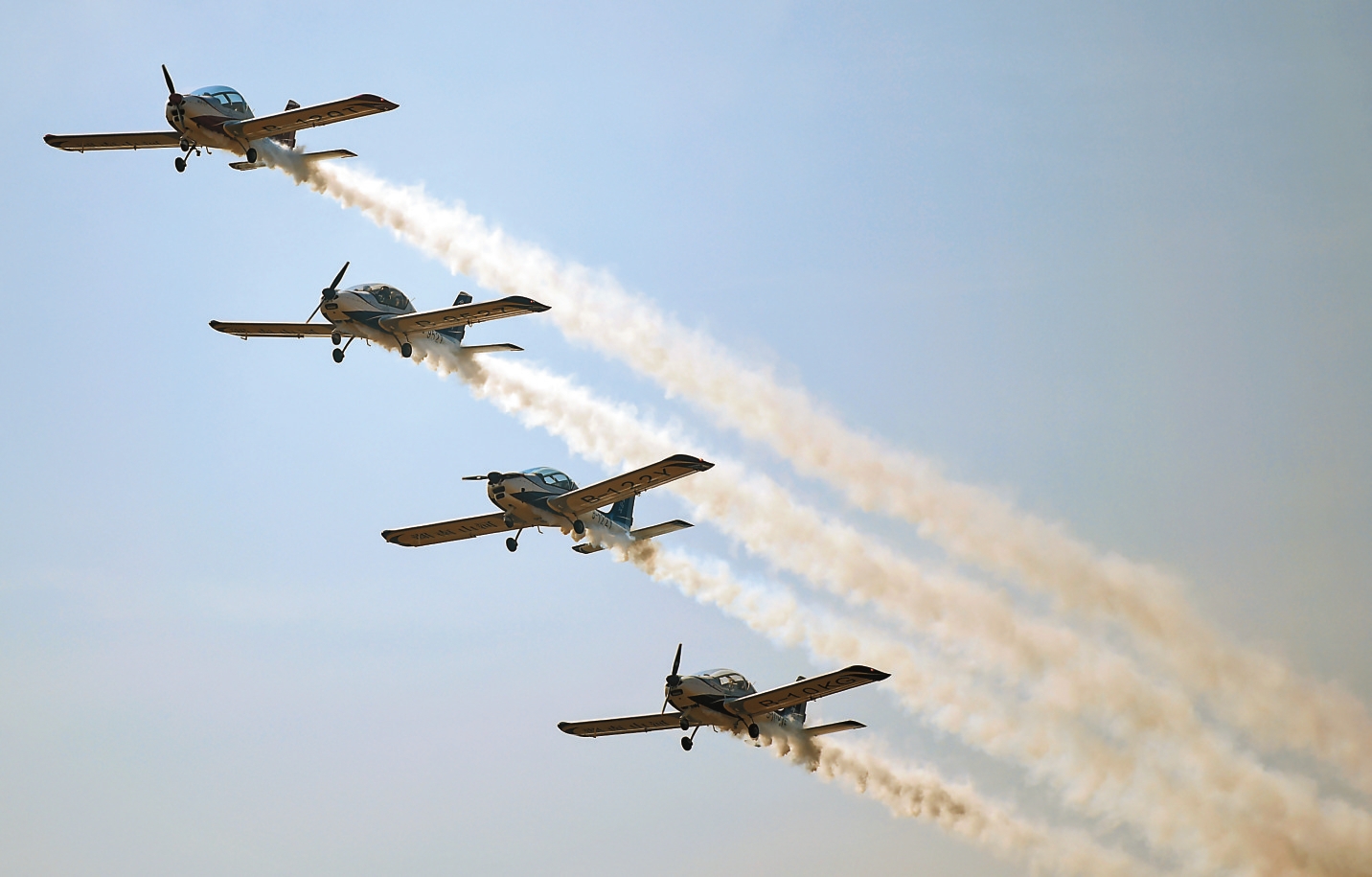 11月23日,2023亚洲通用航空展在珠海国际航展中心举行。开幕式上,欧洲“穿越骑士”飞行表演队、山河飞行表演队、交通运输部南海第一救助飞行队等进行了飞行表演,为观众带来了精彩纷呈的视觉盛宴。图为11月23日,山河飞行表演队在2023亚洲通用航空展开幕式上进行飞行表演。