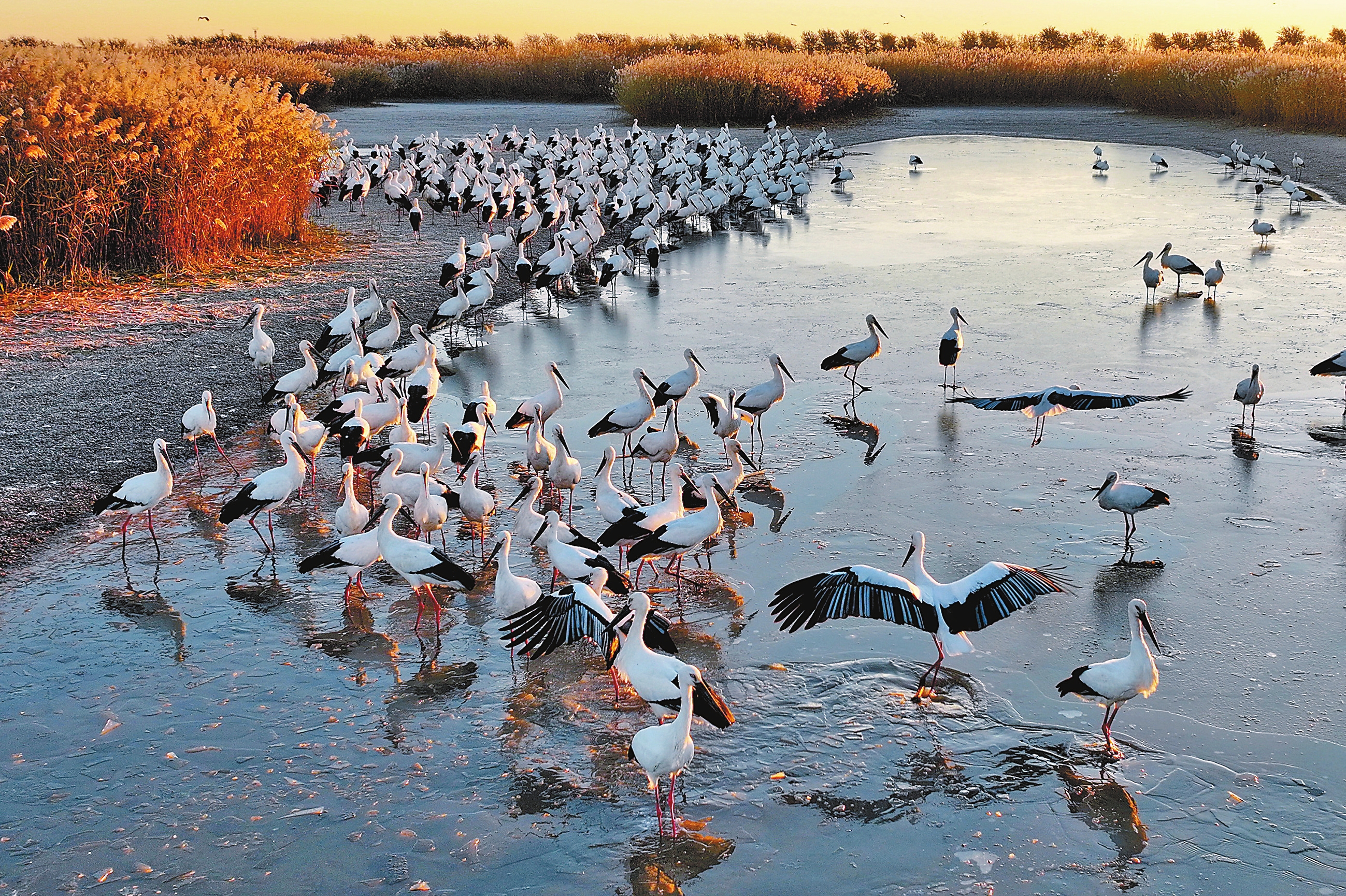 近日,大批东方白鹳、天鹅、大雁等候鸟飞抵河北省唐山市沿海湿地觅食、停留,形成一道亮丽的风景。图为11月25日,东方白鹳在河北省唐山市沿海湿地觅食。新华社记者 杨世尧 摄