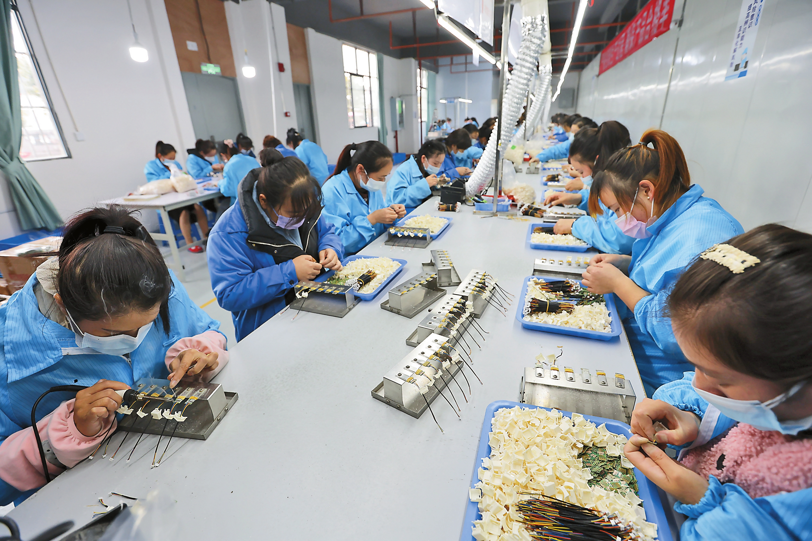 图为盛之发机电会泽有限公司工人在加工电子元件。