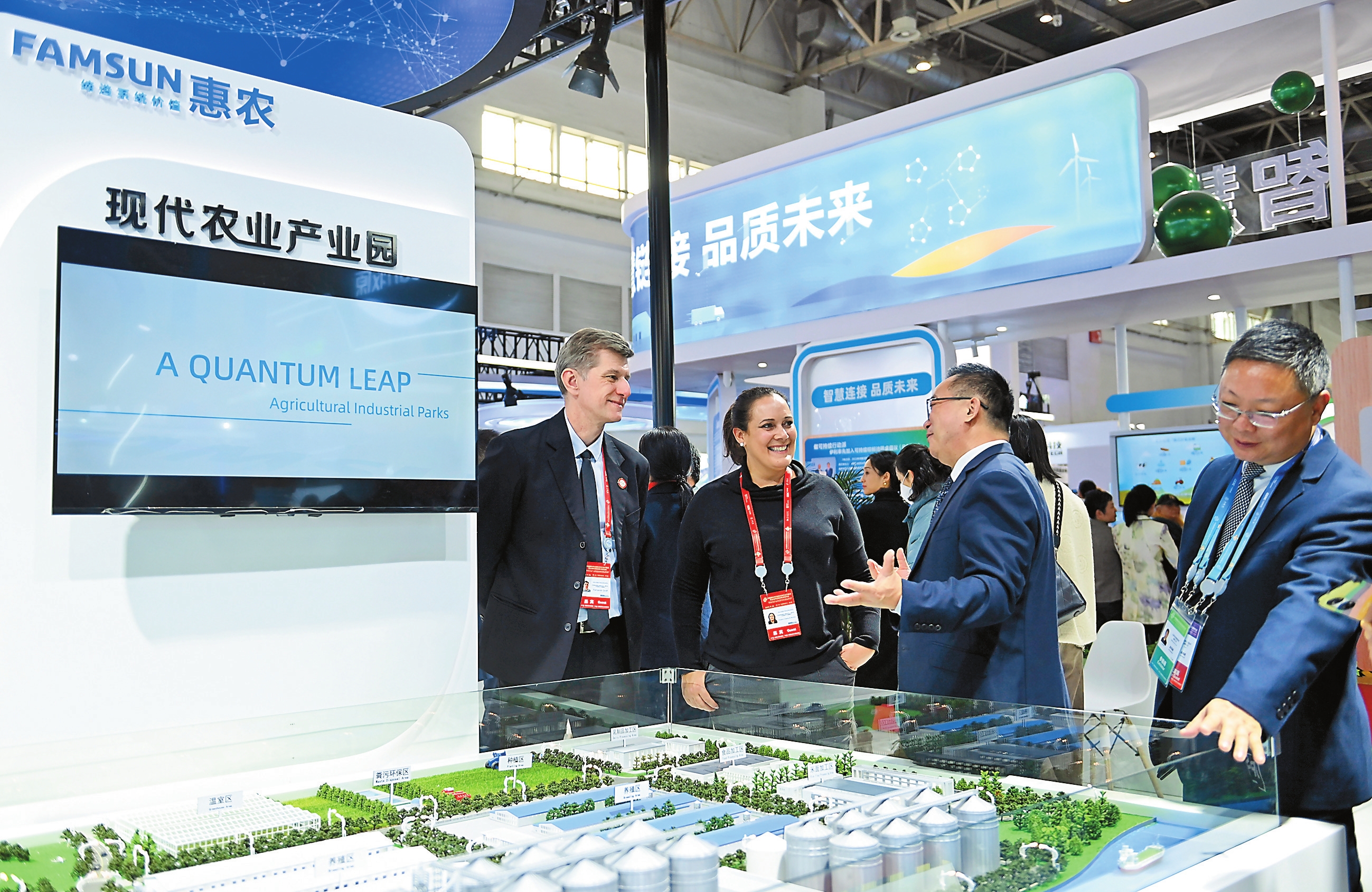 图为链博会参展商与参会嘉宾在绿色农业链展区交流。