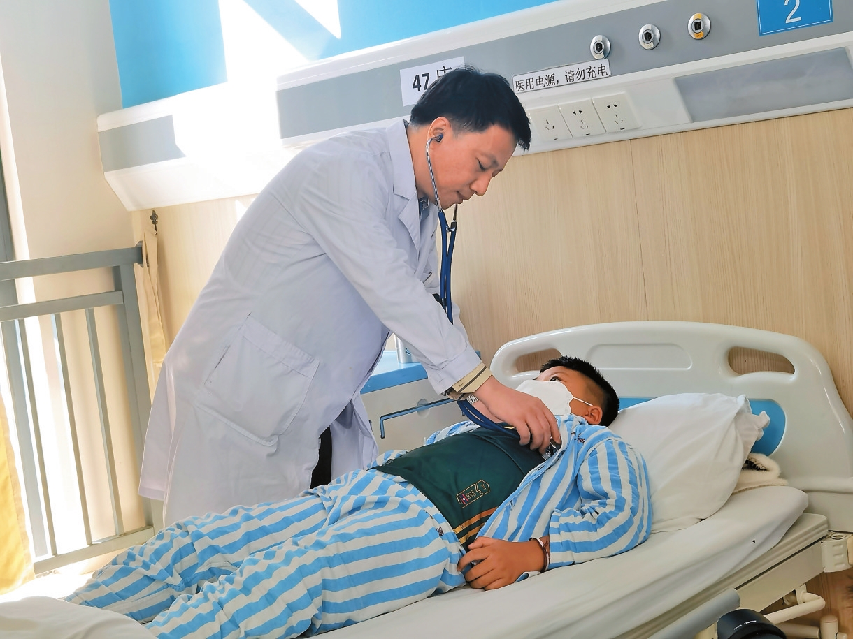 在医院小儿外科病区,中国医学科学院阜外医院驻昆专家董硕在为患儿家属耐心讲解即将开展的手术治疗方式。4名患儿将进一步完善术前检查,近期接受手术治疗。