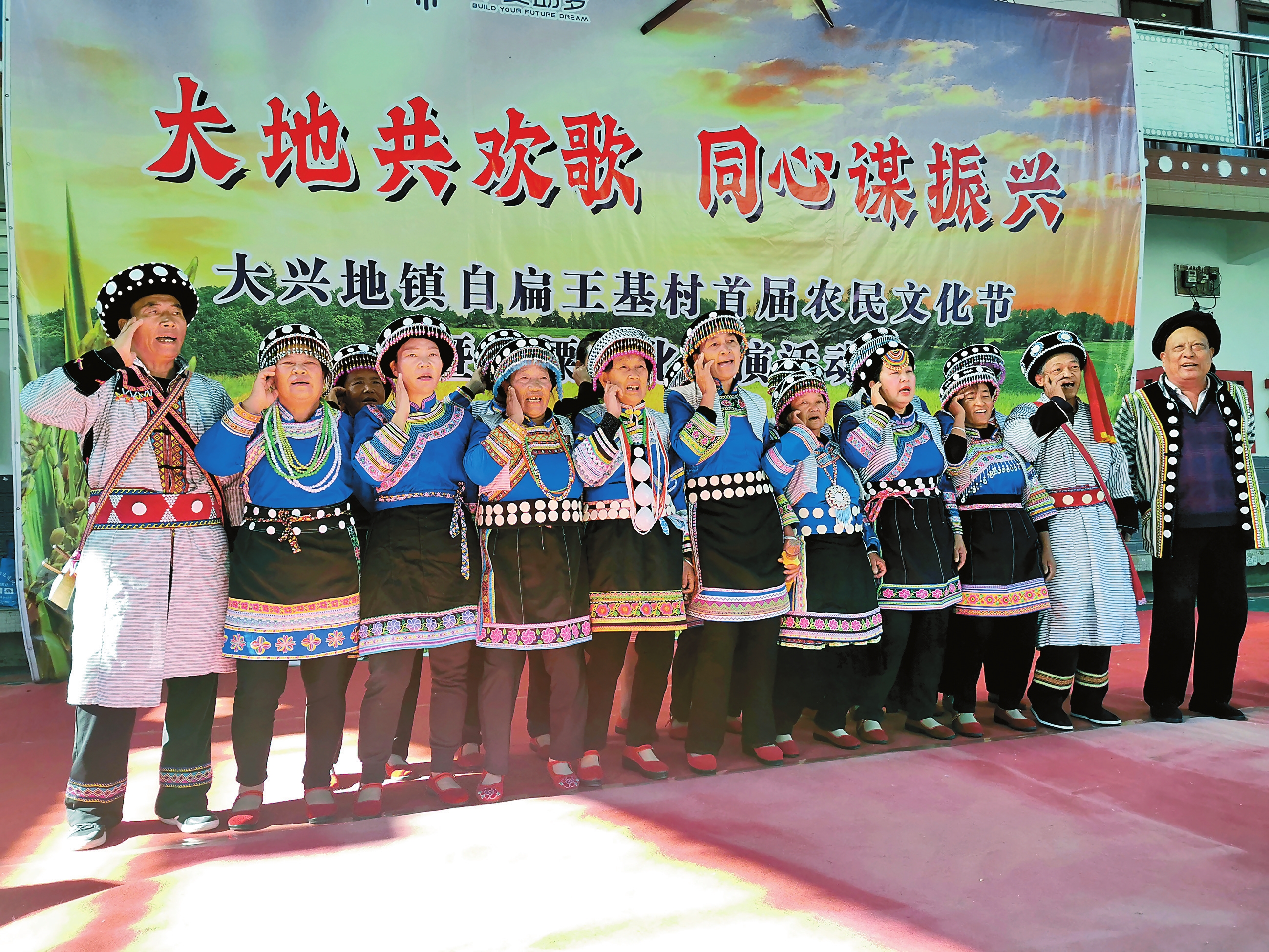 “共产党派来中交亲人,边疆农民齐欢喜。”舞台上,省级非遗传承人八才三和村民族艺术团表演自编的摆时《感恩歌》,表达了广大群众对中交集团的感恩之情,引来台下热烈的掌声。11月24日,泸水市大兴地镇自扁王基村文体活动广场,主题为“大地共欢歌,同心谋发展”的首届农民文化节暨傈僳文化展演正在举行。