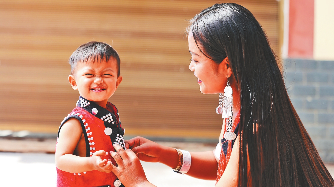 红色和黑色是佤族服饰的主色调,以黑为质、以红为饰,寓意着吉祥美丽。每逢节日,每位佤族妈妈都会亲手为孩子缝织新衣,寓意无病无灾、健康平安。一针一线,丝丝缕缕,凝聚着无限温情和爱心,穿上新织的佤锦新衣,不仅是妈妈的爱,更是民族文化的传承。