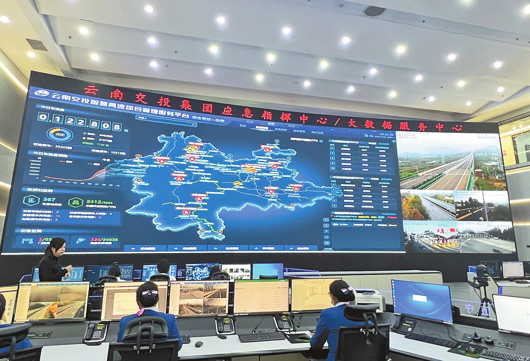 走进云南交投集团大数据服务中心,营运分析、出行服务、联网收费、路网监测、应急指挥等业务系统数据归集在同一平台,工作人员能实时监测了解各条高速公路、各个收费站及车辆行驶情况,当发生异常时及时决策处理。
