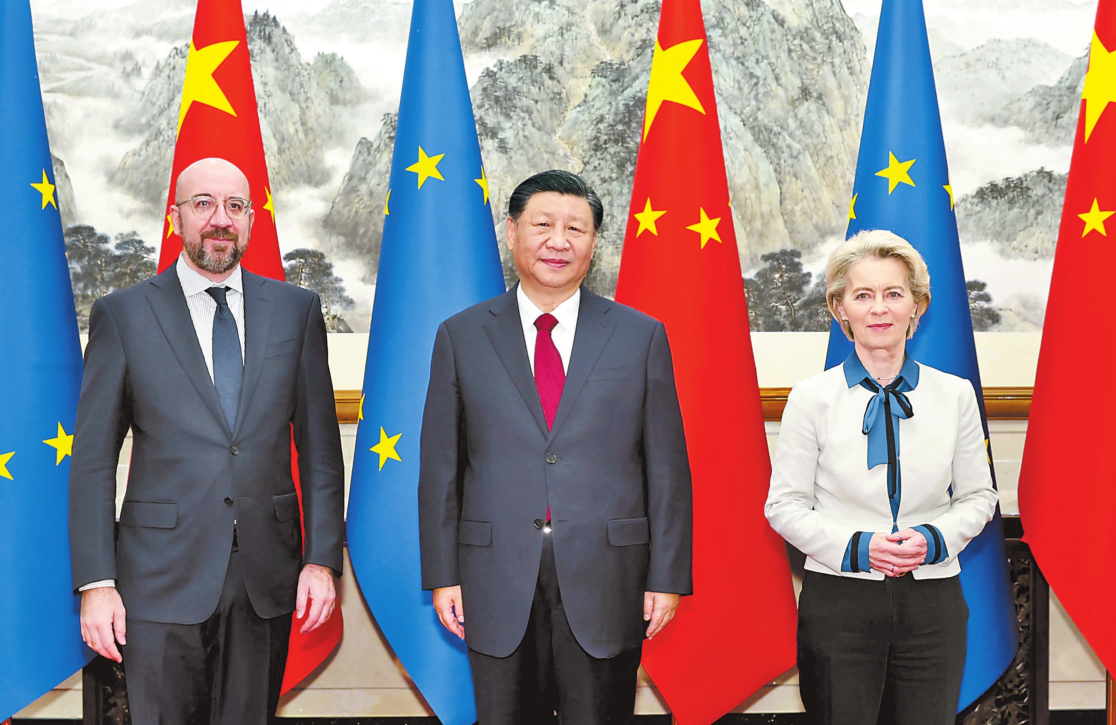 12月7日,国家主席习近平在北京钓鱼台国宾馆会见来华举行第二十四次中国—欧盟领导人会晤的欧洲理事会主席米歇尔和欧盟委员会主席冯德莱恩。新华社记者 黄敬文 摄