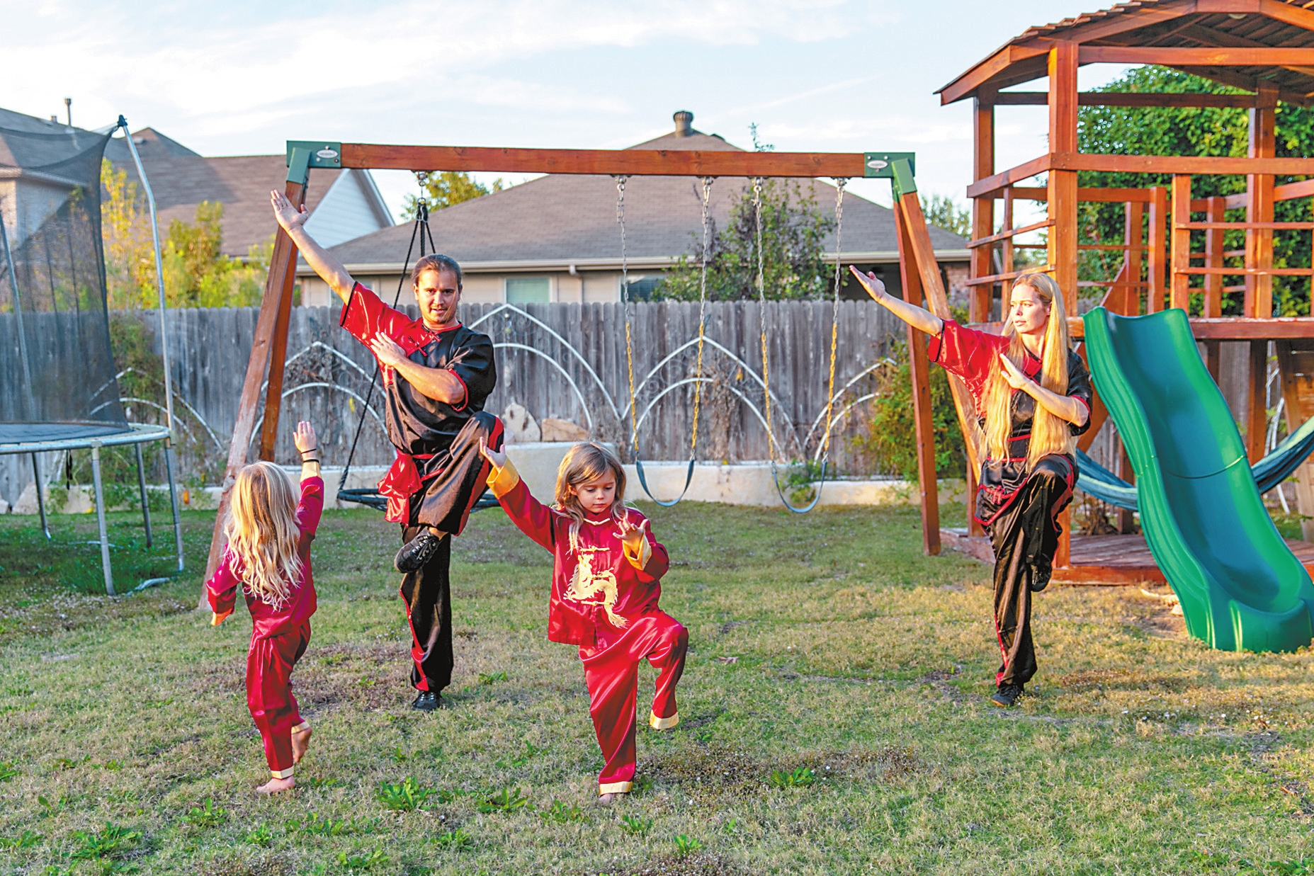 11月8日,在美国中南部得克萨斯州沃思堡,大卫·绍塞多(左二)和妻子安吉拉(右一)以及他们的孩子斯凯、里弗在家中后院的草坪上练武。