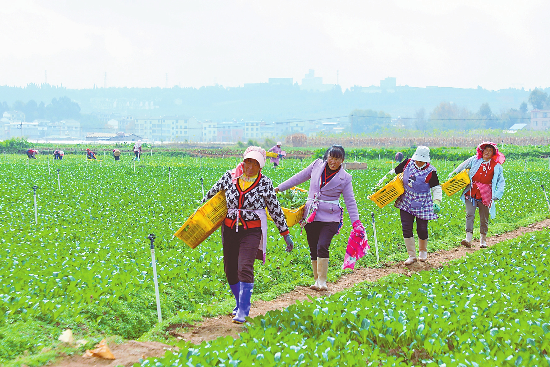 陈兴丽一家有6口人,“老公去江苏打工,我留在家中照顾老人小孩。我平时到村子旁边的蔬菜基地摘菜,干完活就可以回家,既方便照顾老人小孩,又可以挣到钱。”陈兴丽两只胳膊一边夹着一筐菜,准备送到基地旁边交给蔬菜运输队。“我今早摘了约150公斤菜心,合作社按每公斤1.2元付工费,可以挣到约180元钱。”她笑着说。