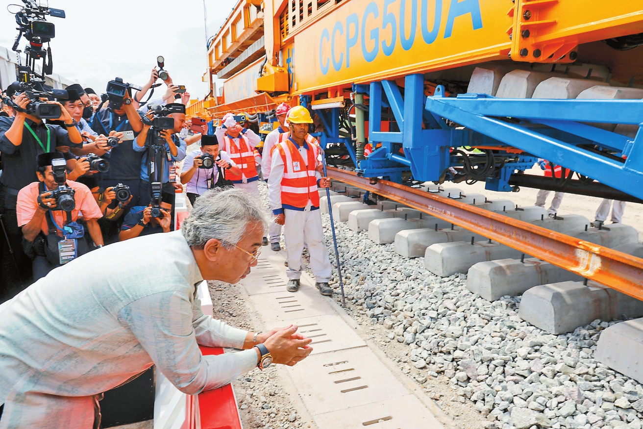 图为12月11日,在马来西亚彭亨州首府关丹市,马来西亚最高元首阿卜杜拉观看铺轨。新华社发 张纹综 摄
