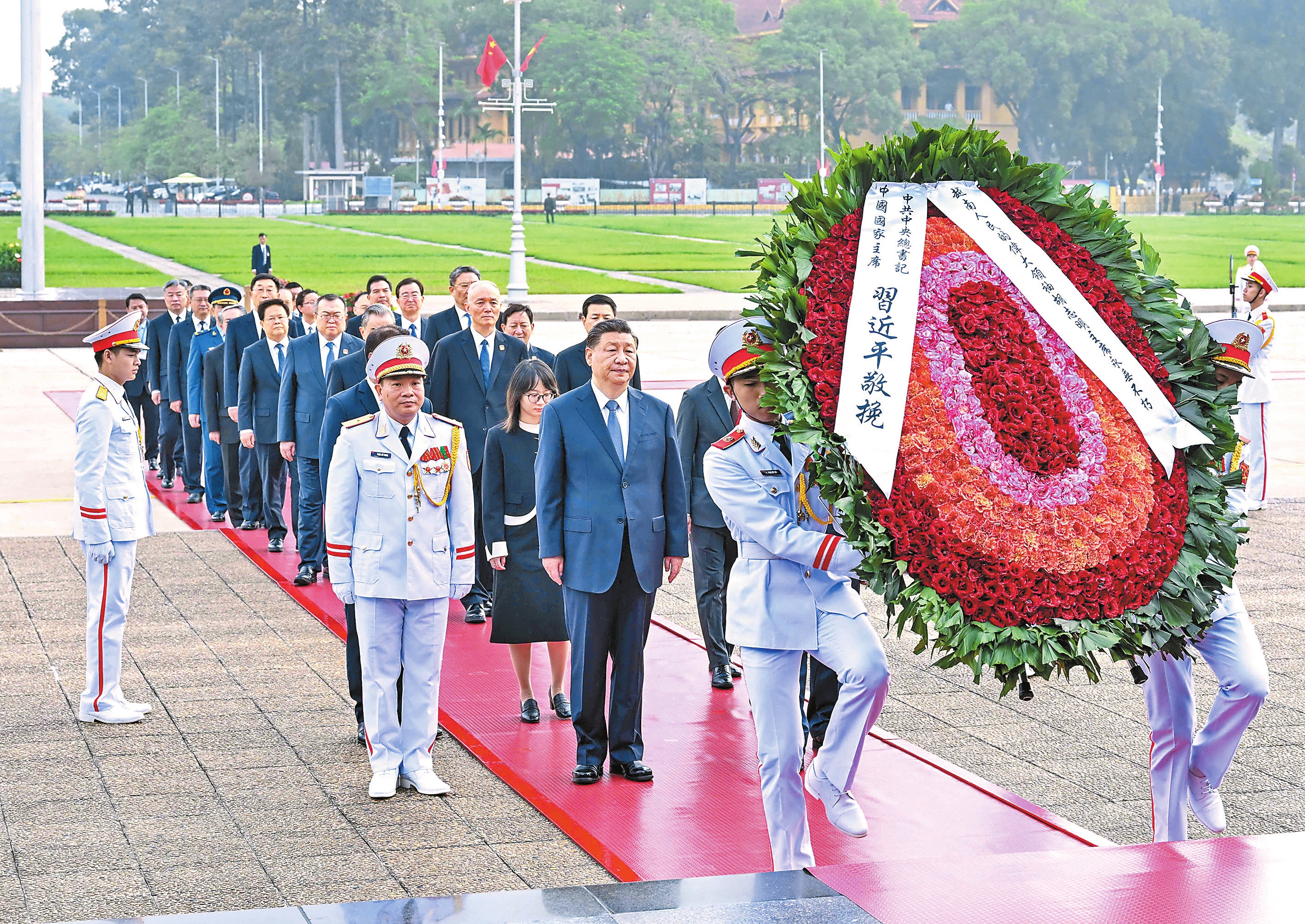 当地时间12月13日上午,中共中央总书记、国家主席习近平在河内瞻仰胡志明陵并敬献花圈。新华社记者 申宏 摄