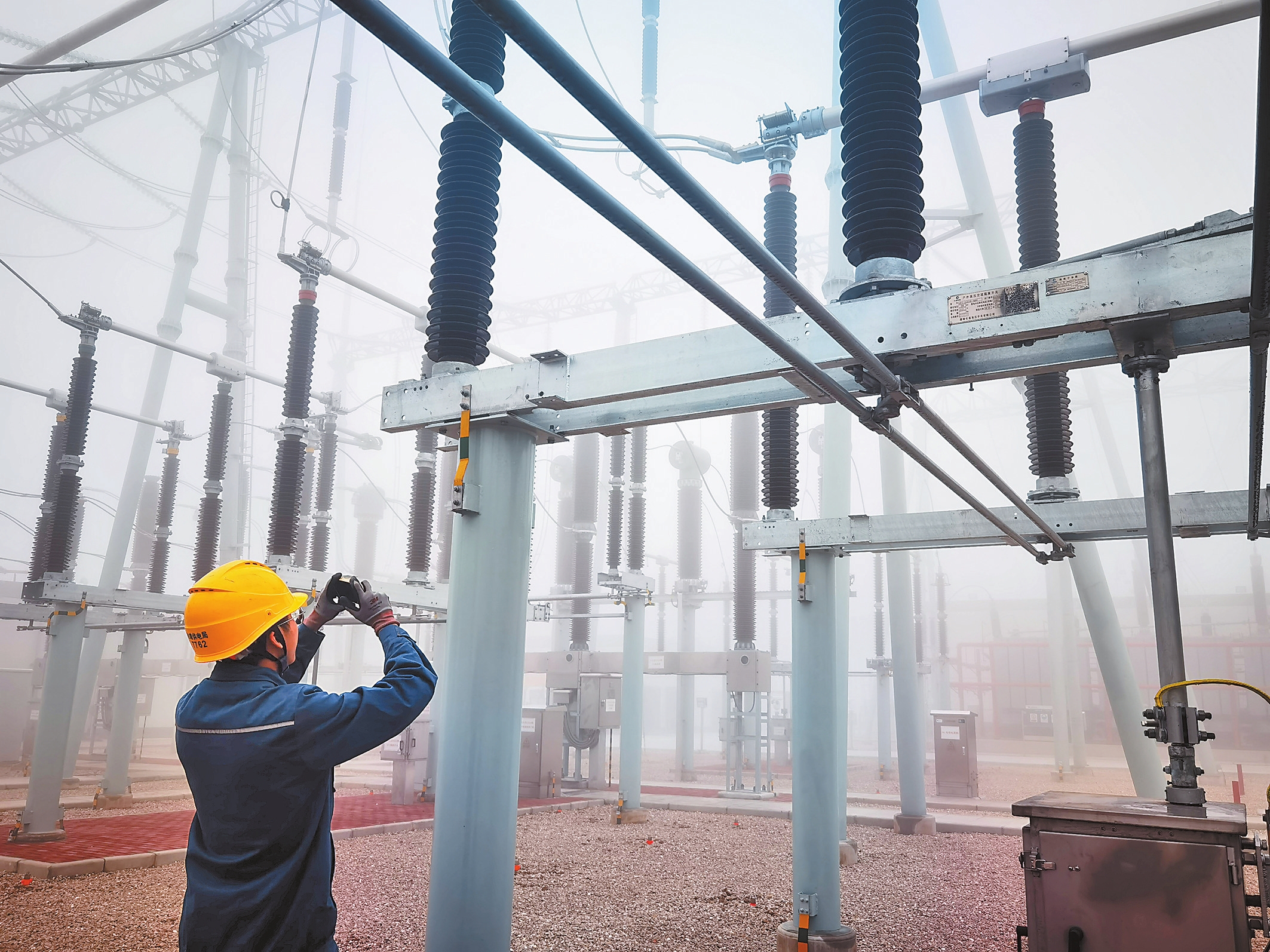 近日,曲靖市气温骤降,曲靖供电局各部门均提前部署各项防冰抗冰工作,及时排查治理冰灾隐患,持续关注西电东送主通道设备和高铁牵引站等重要用户供电线路。图为曲靖供电局变电运行人员在220千伏中寨变电站对设备开展特巡检查,确保电网设备安全运行。