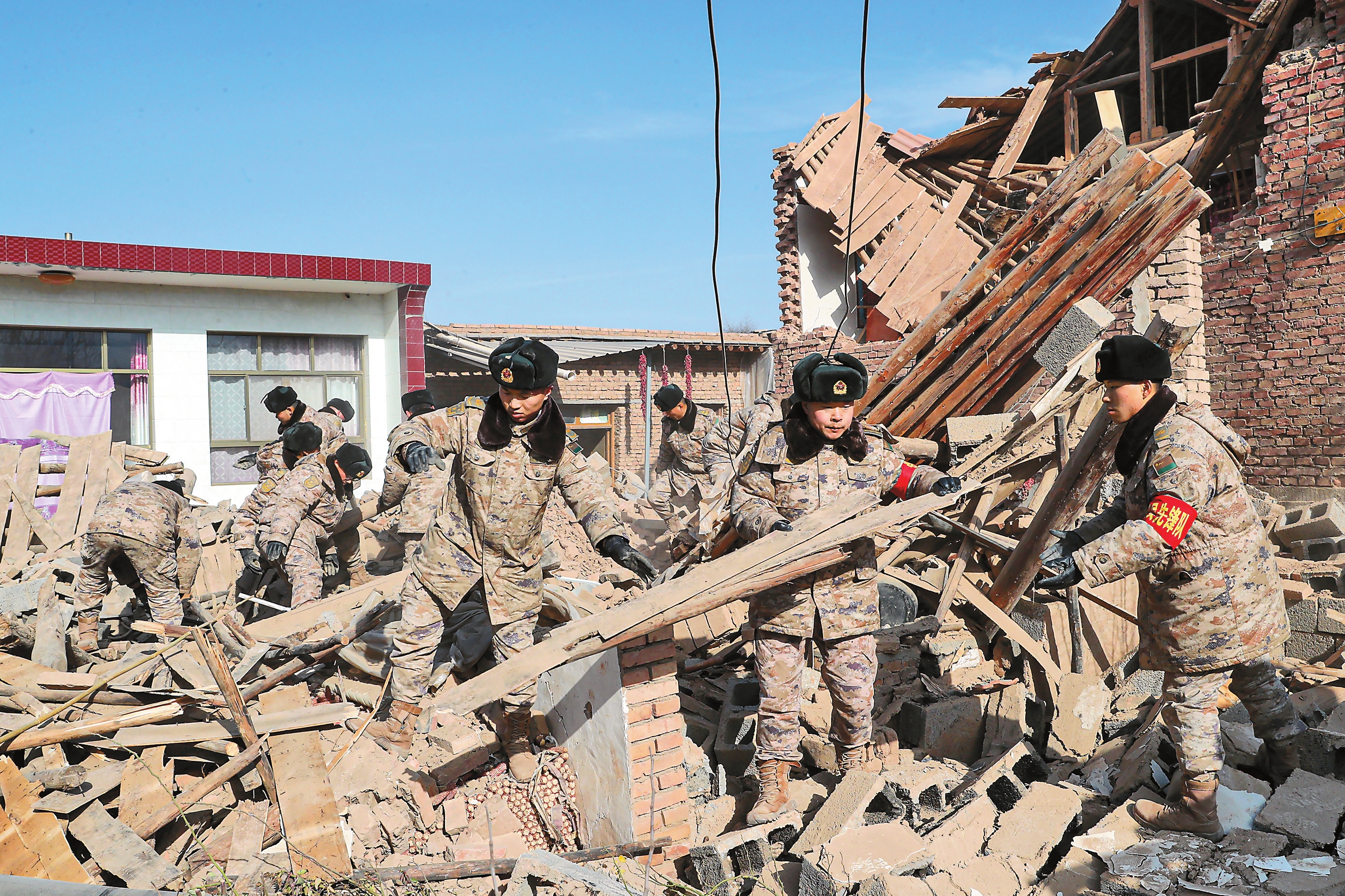 18日23时59分,强震袭来。武警甘肃总队临夏支队官兵被震感惊醒,很快察觉到情况异常,迅速按照抢险救援预案集结准备。震后不到1小时,小队长霍星宇带领由10余名特战队员组成的先遣分队向灾区进发。这支队伍里,一半以上是党员。