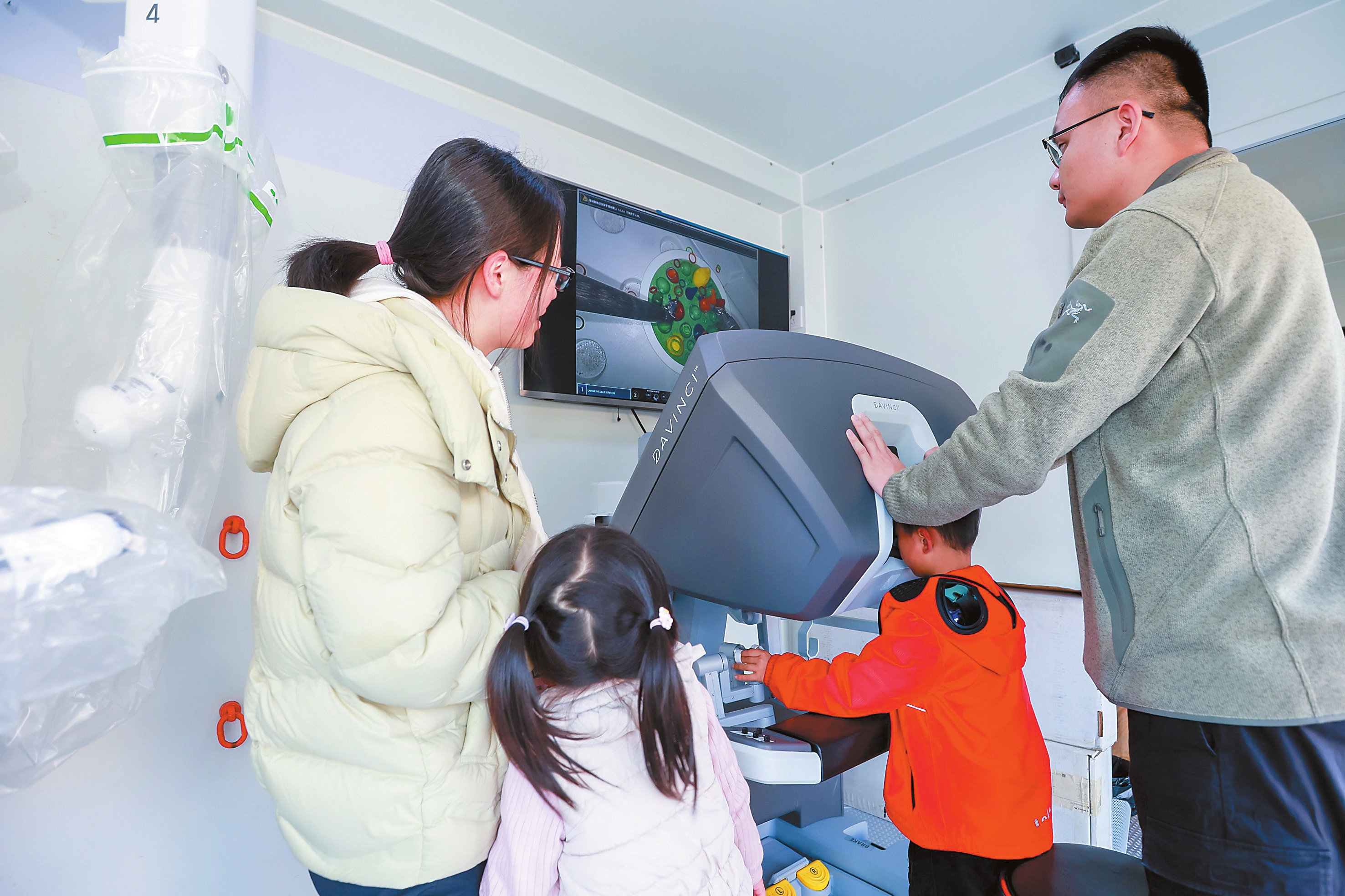 本报讯(记者 党晓培 见习记者 李燕) “这台手术机器人的医生操控台有3个部分,上面是头部感应器和视野部位;中间是操控台,可以用手进行相应的操作;下面是用脚控制的区域,比如离合器、转换器等。”昆明市第一人民医院(甘美医院)近日举行了手术机器人科普开放日暨2023年达芬奇科普行活动,该院泌尿科主任孙洵在现场向市民介绍了达芬奇手术机器人的相关知识。