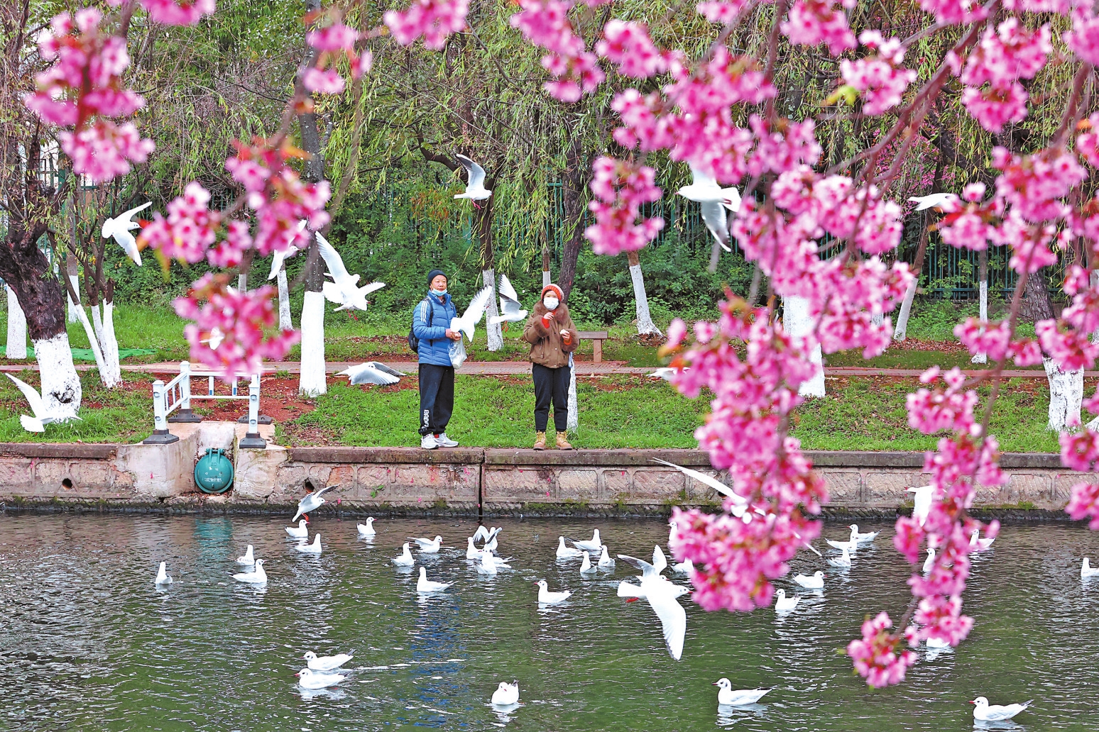 图②:游客在昆明船房河畔赏樱、观鸥。