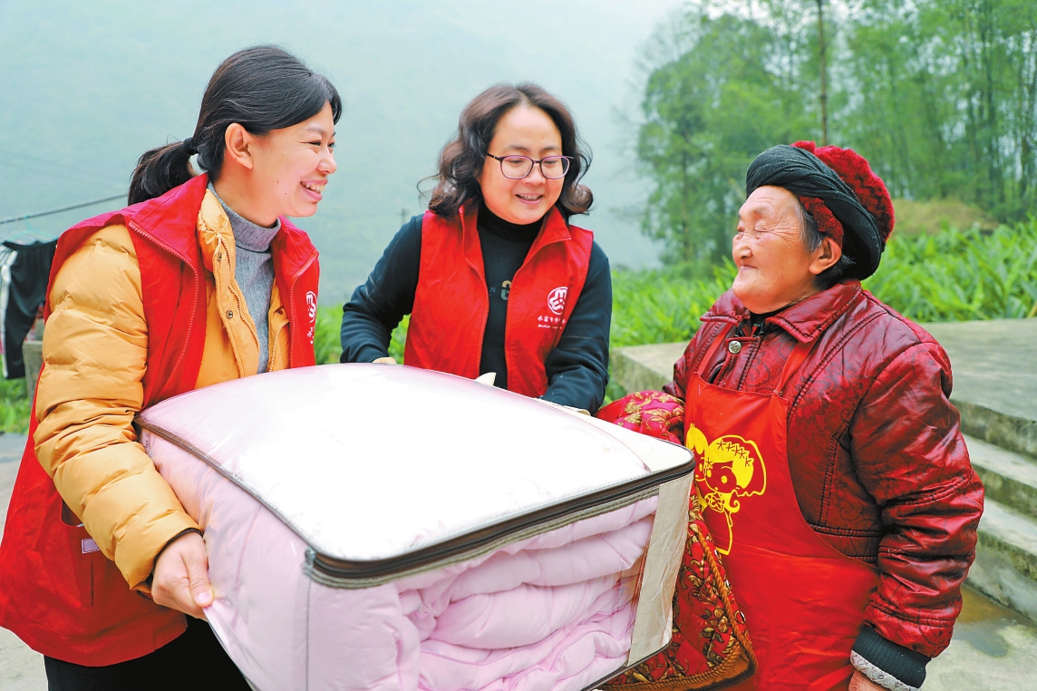 图④:水富市妇联干部开展暖冬行动,将棉被等防寒物资送到留守老人手中。
