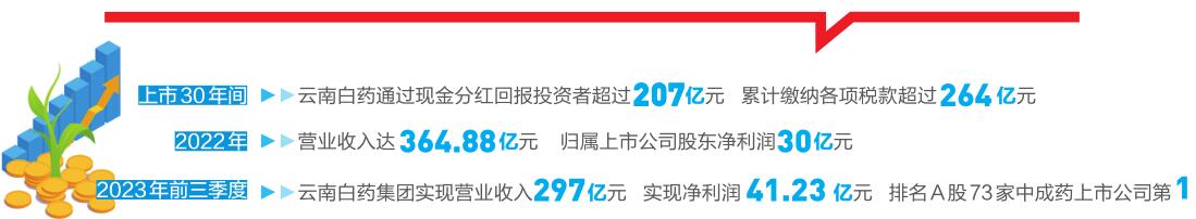 从资本市场融资仅16亿元,30年间,云南白药通过现金分红回报投资者超过207亿元,累计缴纳各项税款超过264亿元。上市30年,公司股票市值从2.7亿元到稳定在900亿元左右,走出了一条漂亮的上扬曲线。作为中成药与大健康产业头部上市公司,云南白药用责任与担当,在资本市场写下高质量发展品牌故事。