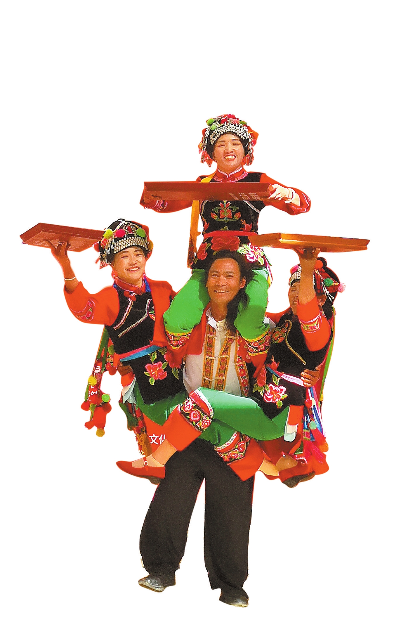 决赛现场精彩纷呈,每一支跳菜队都有着独家绝活,有的利用离心力举着托盘旋转而不洒出一滴汤汁,有的口衔八仙桌,连同桌上的菜品,重量超过40斤,展现跳菜技巧中的“口功”,还有的一个人身上能扛两三名演员,每位演员又各自稳稳端着满满两碗菜。来自小湾东镇的队伍中还有3名“小传承人”,其中年纪最小的跳菜演员仅有3岁。最终,来自无量山镇的施旺清争得“跳菜王子”桂冠,公郎自强黄草坝跳菜队获“跳菜王子”团队奖冠军。