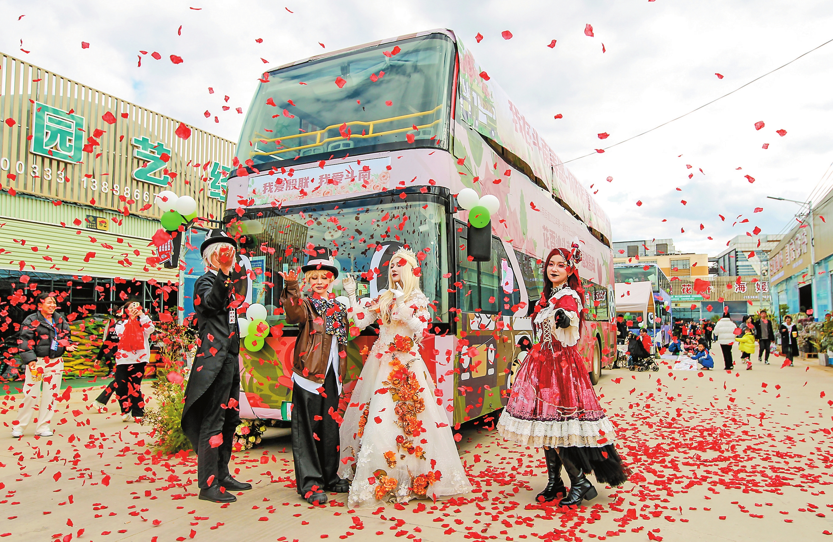图③:4辆主题巴士亮相昆明盆花苗木市场,吸引了众多市民、游客围观。
