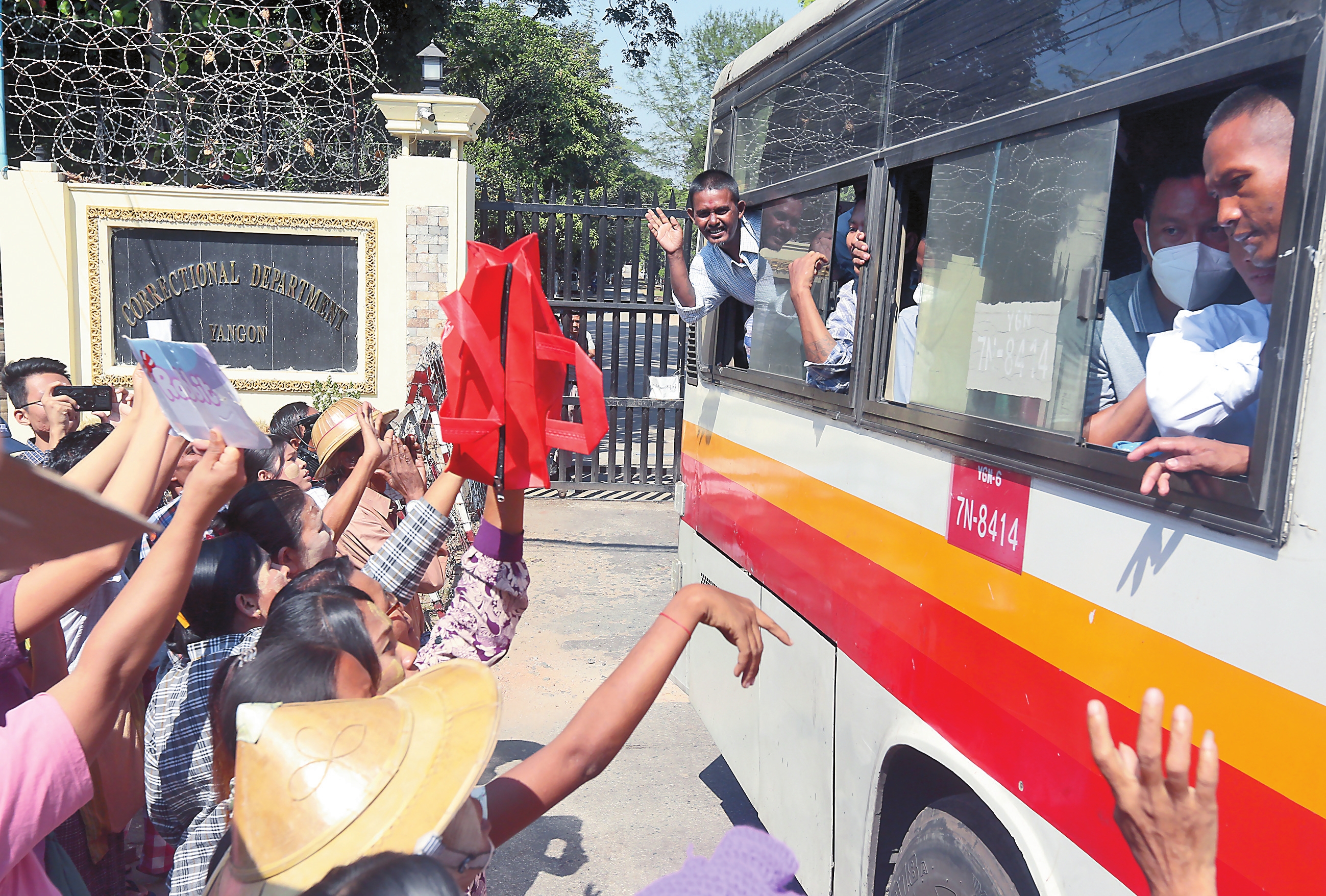 在1月4日的缅甸第76个独立日,缅甸国家管理委员会发布特赦令,赦免9700余名囚犯。图为1月4日,在缅甸仰光,被释放的囚犯乘坐大巴车离开监狱。 新华社发 亨曼 摄