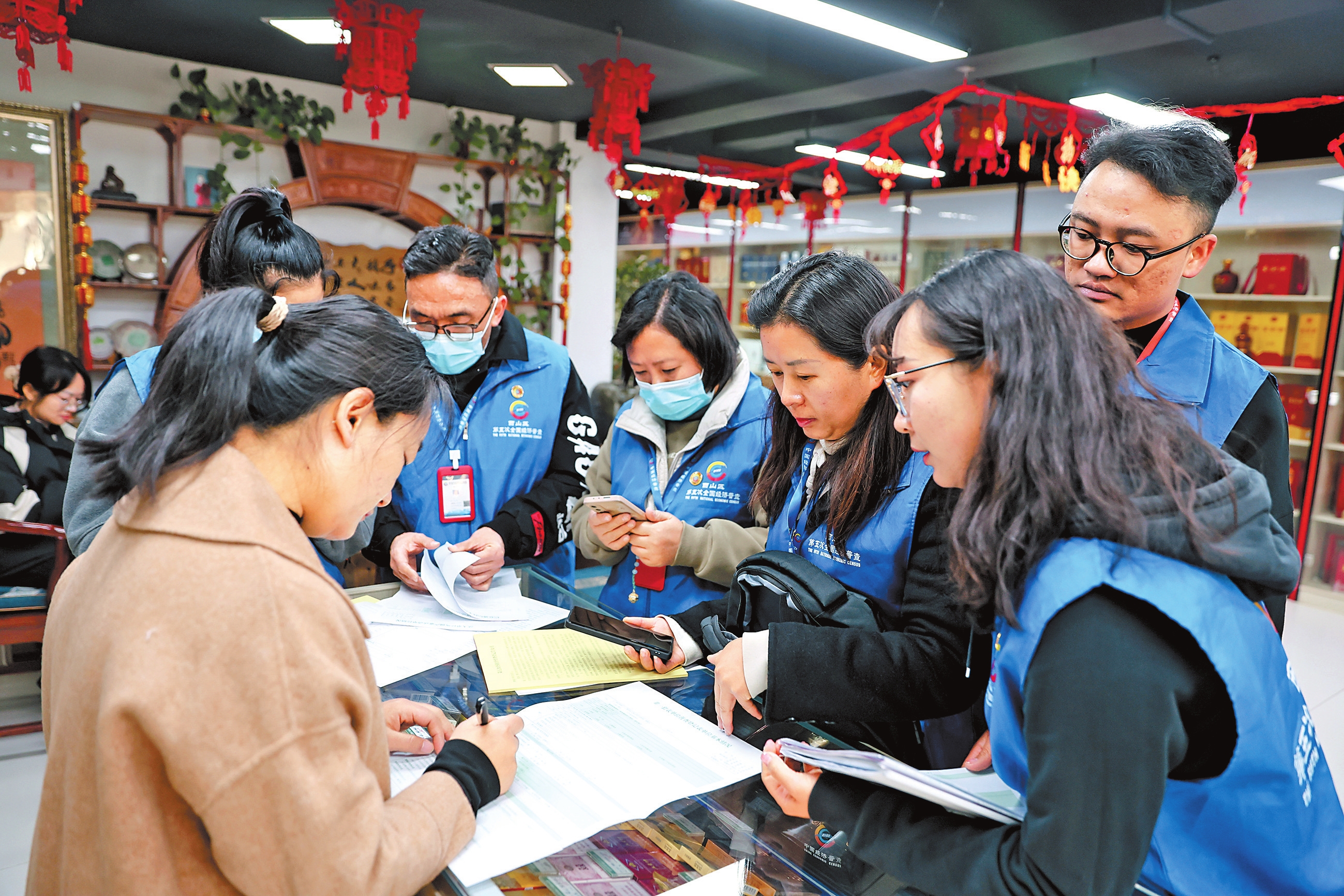 昆明市积极动员社区网格员、社区党员等基层工作人员加入第五次全国经济普查工作队伍,截至目前,全市组织开展“两员”选聘12052人,其中普查员9191人,普查指导员3166人。图为西山区棕树营街道白马西区社区普查员在辖区对经营场所开展经济普查。本报记者 黄兴能 摄