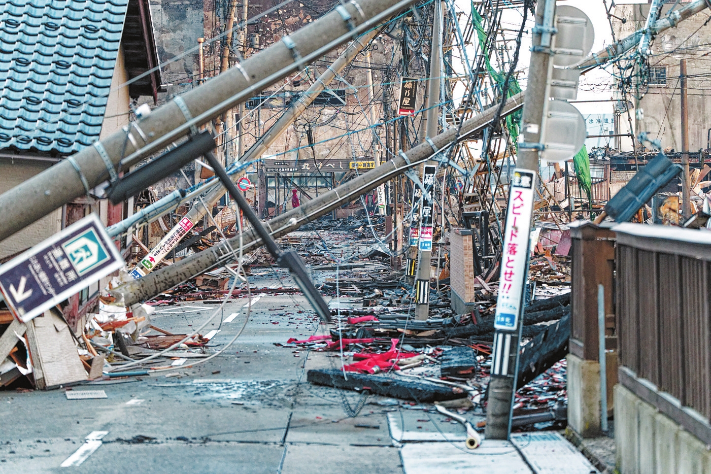 图为日本石川县轮岛市“轮岛早市”被地震引发的大火烧成废墟。