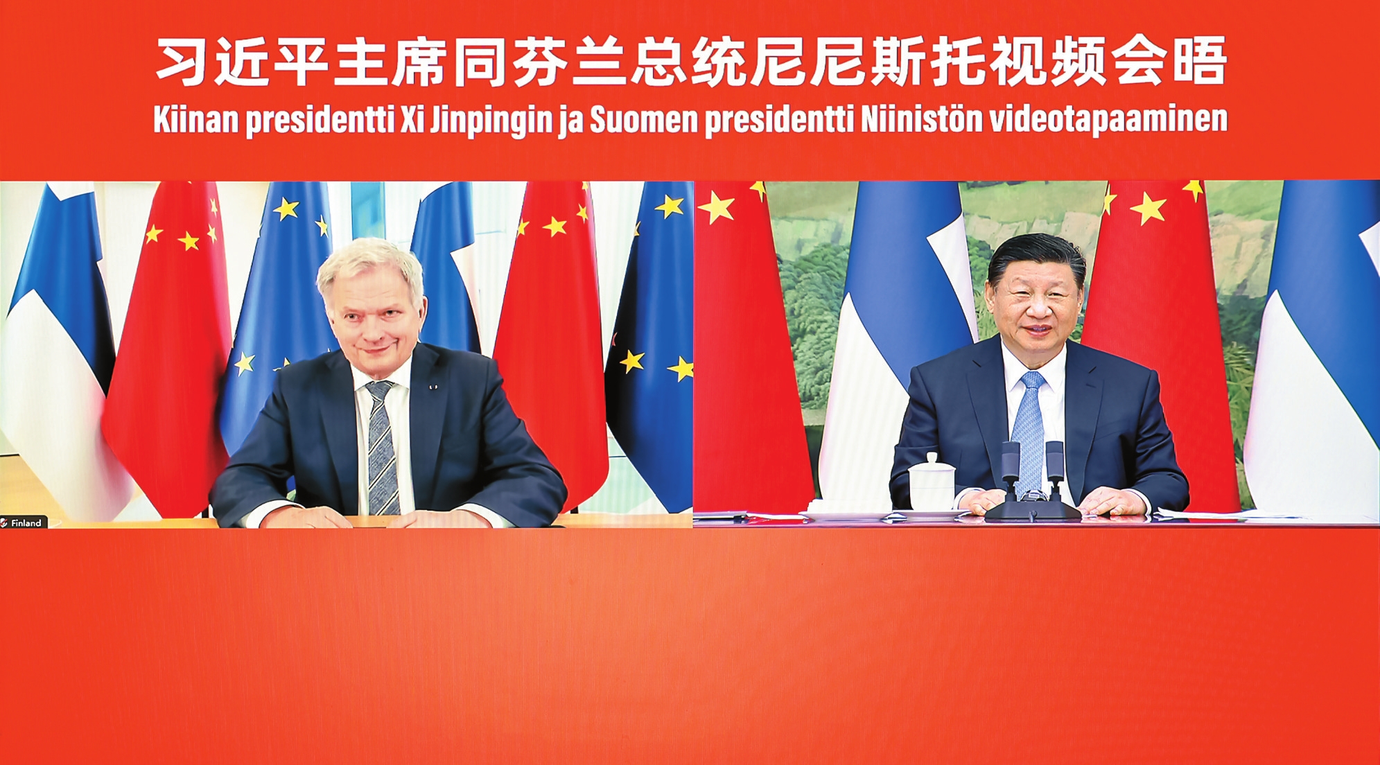 习近平指出,芬兰是最早同新中国建交的西方国家之一,长期坚持对华友好政策,特别是尼尼斯托总统一直积极致力于推动芬兰对华务实合作和各领域友好交往,我对此表示赞赏。近年来,中芬关系保持平稳发展,两国在森林工业、农食产品、信息通信、能源环保、科技教育、冬季运动等领域合作不断深化,给两国人民带来实实在在的好处,我对此感到高兴。