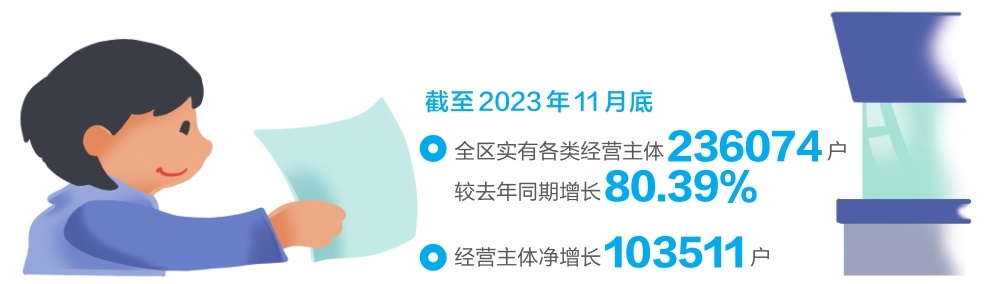 近年来,盘龙区以打造环节最少、时限最短、门槛最低、效率最高的一流营商环境为目标,发挥“政务+”聚合优势,着力为群众和企业提供有速度、有温度的政务服务。2023年1至11月,全区经营主体净增长103511户,截至2023年11月底,全区实有各类经营主体236074户,较上年同期增长80.39%。