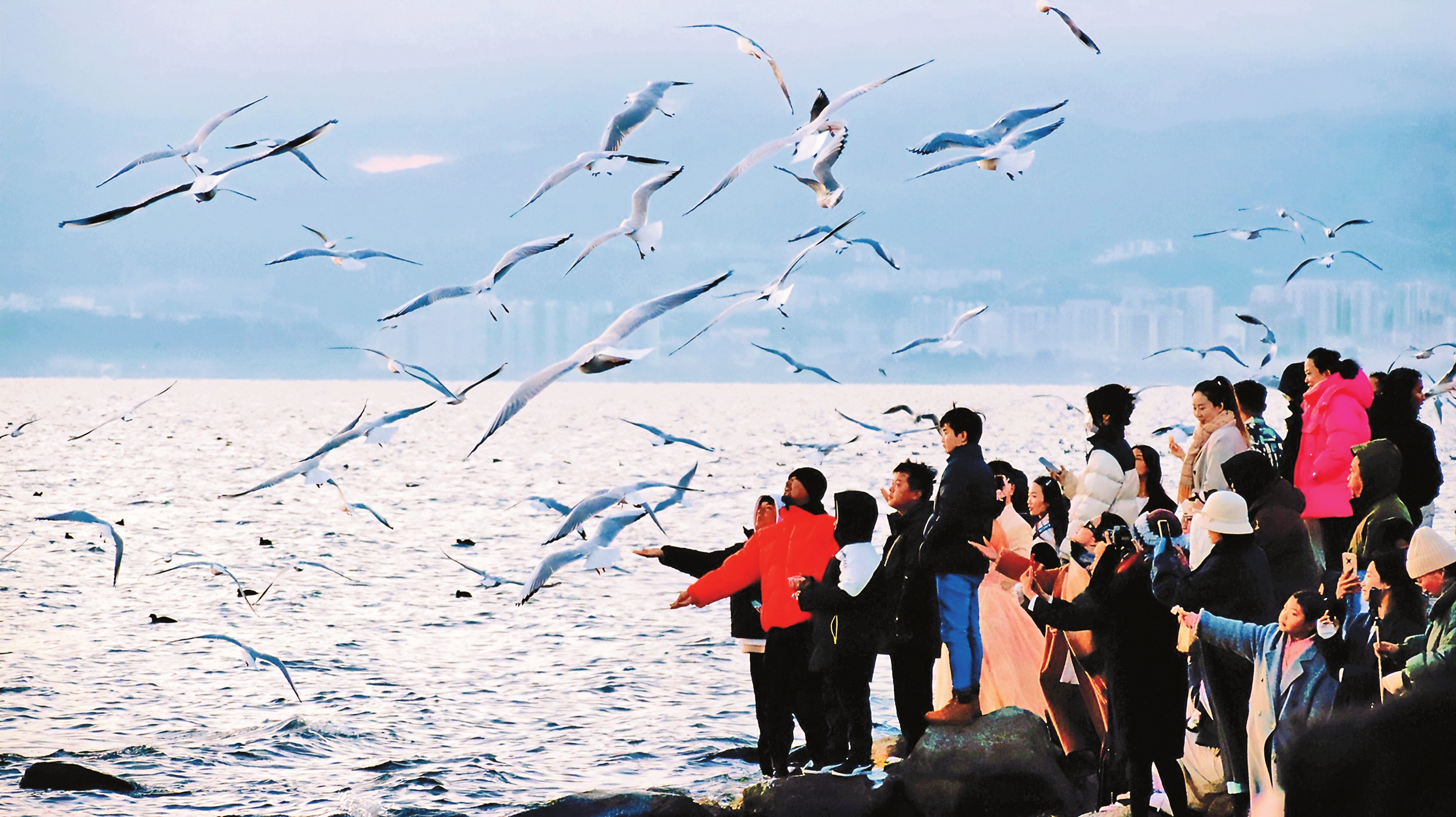 近日,成群的海鸥在洱海生态廊道龙龛码头低空盘旋、翩翩飞舞,吸引了众多市民和游客驻足观赏,人鸥和谐的画面成为一道亮丽风景线。