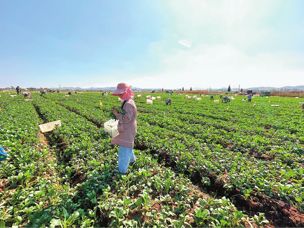 在砚山县稼依镇的蔬菜种植基地里,冬霜在绿油油的菜叶上凝结成细小晶莹的露珠,联兴蔬菜产销农民专业合作社的工人们忙着采摘、运输。阡陌纵横的田间地头呈现出一派生机勃勃的繁忙景象。