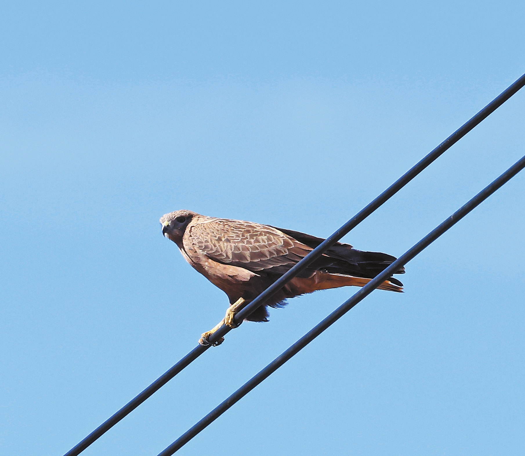 棕尾鵟俗称大豹、鸽虎,隶属鹰形目鹰科鵟属的中型猛禽,体型较普通鵟大且尾呈浅锈色至橘黄色而无横斑;国内主要分布于内蒙古北部、宁夏、甘肃东南部、新疆、西藏南部、青海和云南东部,数量稀少且罕见;栖息于海拔2000米至4000米的荒漠、半荒漠、草原等干燥环境,常立于岩石、电线杆或地面的高处;主要以野兔、啮齿动物、蛙、蜥蜴、蛇、中小型鸟类及鸟卵、动物尸体等为食。目前,该物种被列为国家二级重点保护野生动物,《中国脊椎动物红色名录》将其评估为近危物种。