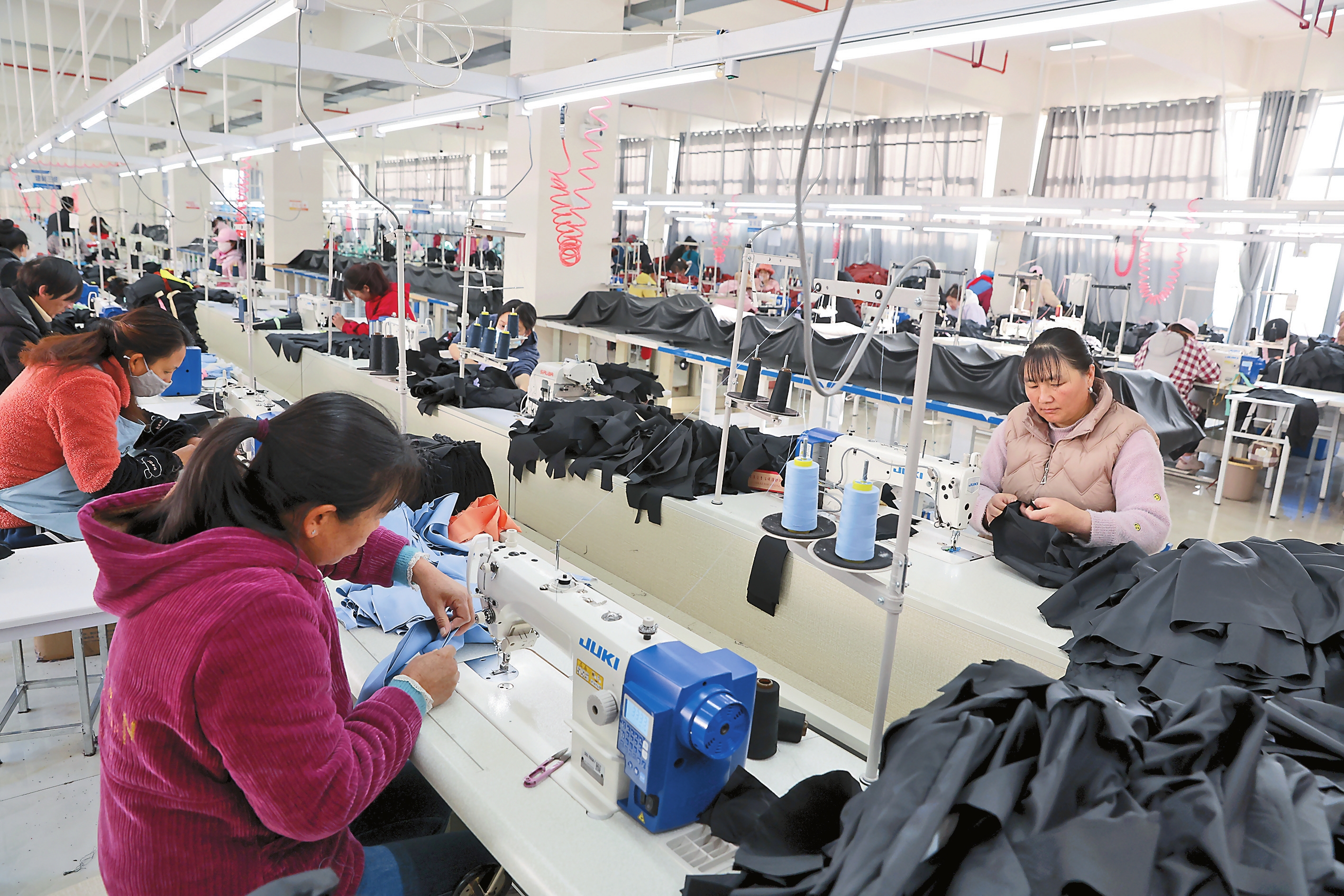 近日,在兰坪白族普米族自治县云南永昌服饰有限公司的就业帮扶车间,随着缝纫机的嗒嗒声,工人们正在熟练地赶制服装。为了让易地搬迁群众就近就业,兰坪县政府2021年引入云南永昌服饰有限公司设立就业帮扶车间,吸纳各乡镇富余劳动力及县城安置点社区群众186人就业,促进群众稳定增收。本报记者 黄兴能 摄