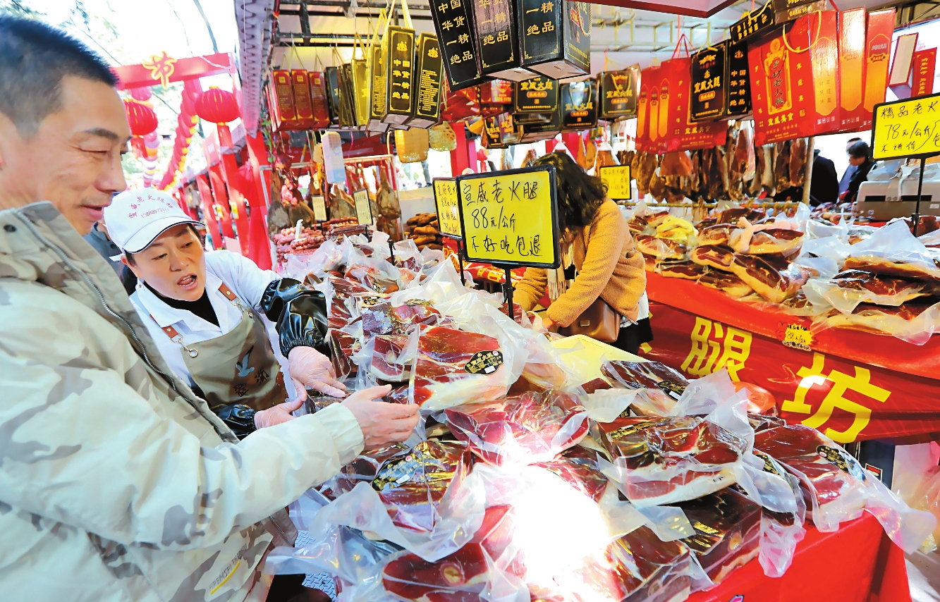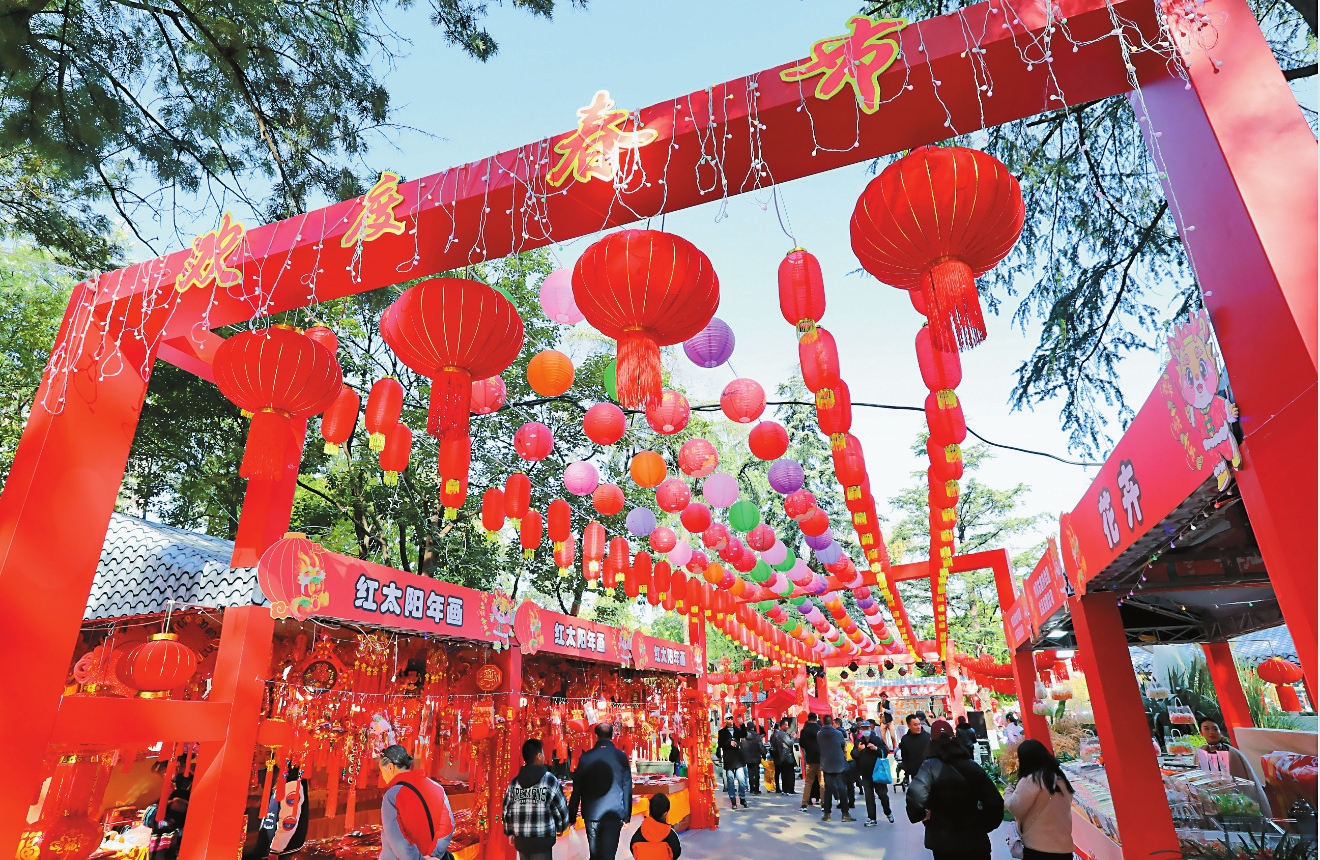 春节临近,春城街头年味渐浓,春节年货街也陆续开街迎客。翠湖年货街上,闹新春的节日氛围格外浓厚。迎接龙年春节的灯笼、春联等传统节庆饰品以及香肠、火腿等食品琳琅满目,吸引了众多市民前来选购。 本报记者 杨峥 摄