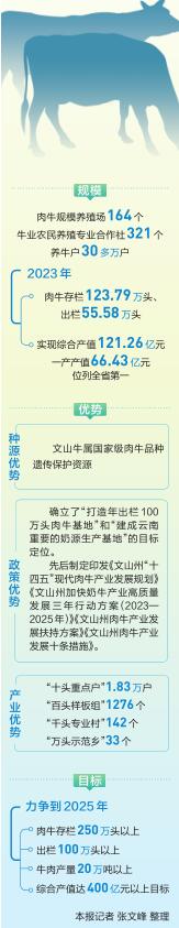 “十四五”期间,文山锚定“到2025年,全州牛存栏达250万头,肉牛年出栏达100万头,牛业综合产值达400亿元”的目标,多措并举打造100万头高品质肉牛基地,全力使产业升值、企业增效、农民增收,不断升温“牛经济”,让百姓过上“牛”日子。