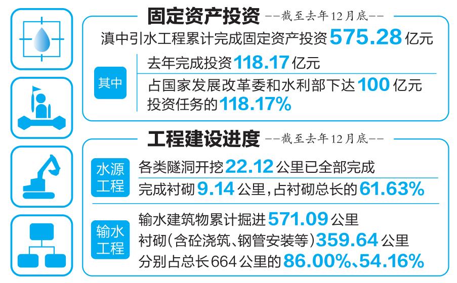 来自省滇中引水工程建设管理局的数据显示:去年,滇中引水工程项目完成投资118.17亿元。完成各类隧洞掘进112.32公里(其中水源工程0.74公里、输水工程111.58公里)。完成衬砌(含砼浇筑、钢管安装等)177.48公里(其中水源工程4.51公里、输水工程172.97公里),超额完成省委、省政府下达的年度建设任务。