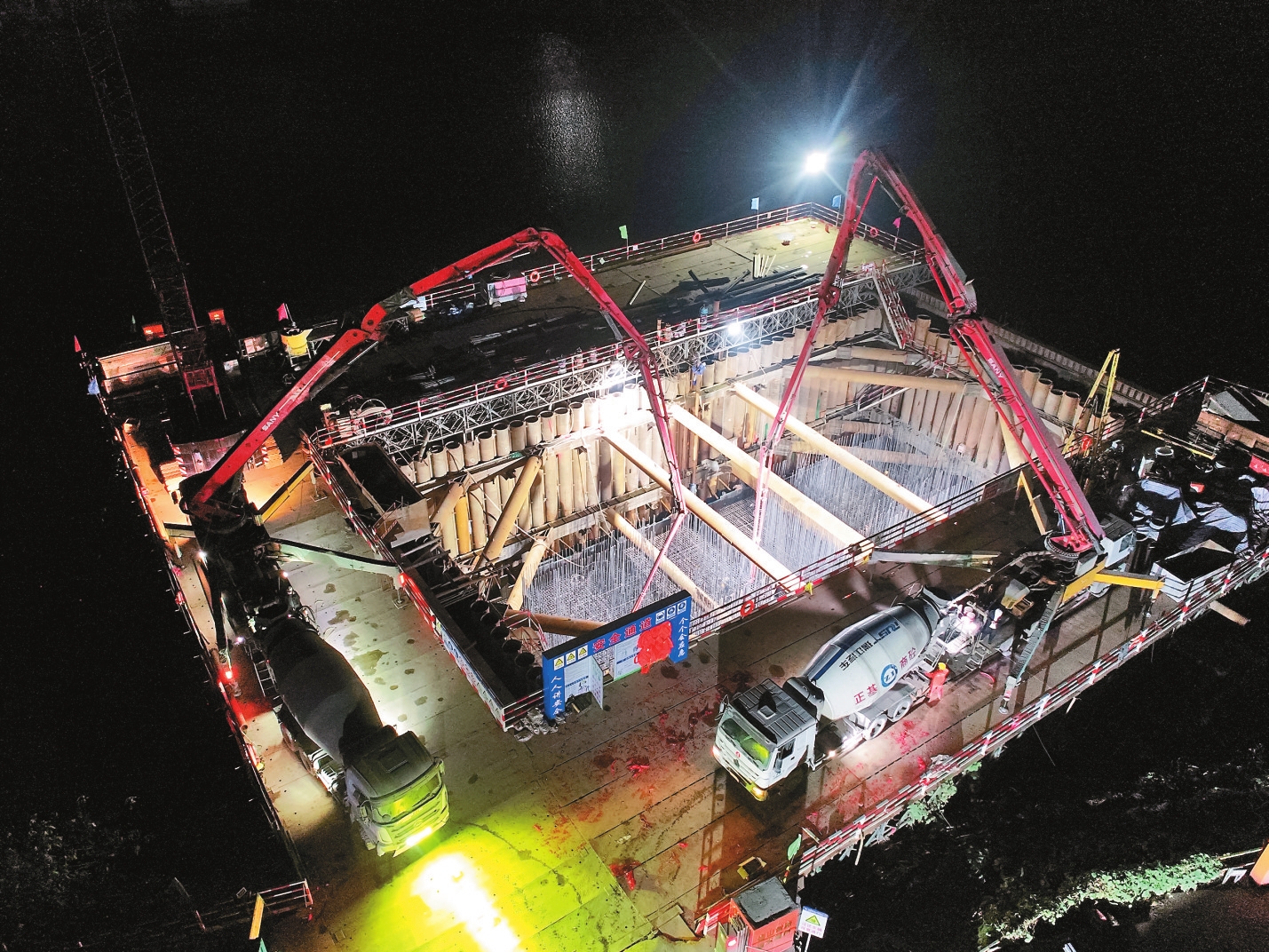 项目负责人介绍,为确保承台顺利浇筑和质量,项目团队超前谋划,结合工程特点制定详细的专项施工方案,采用竖向分层、横向分段、从四周向中心推进连续浇筑工艺,并通过四层冷却循环水等降温措施,防止混凝土因水化热引起结构裂缝。此外,技术团队还采用预埋测温元件实时监控混凝土内外部温度,保障施工质量。