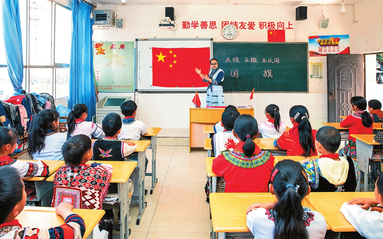 “‘五旗’指的是中华人民共和国国旗、中国共产党党旗、中国人民解放军军旗、中国共产主义青年团团旗、中国少年先锋队队旗。‘五徽’指的是中国共产党党徽、中华人民共和国国徽、中国人民解放军军徽、中国共产主义青年团团徽、中国少年先锋队队徽。‘五认同’指的是对祖国的认同、中华民族的认同、中华文化的认同、中国共产党的认同、中国特色社会主义的认同。”在富民县罗免中心小学,老师正在给学生们开展“五旗五徽五认同”教育实践活动。这个有着汉族、彝族、苗族、傈僳族等多个民族的学校,沐浴着党的民族政策的光辉,将民族团结进步教育融入德智体美劳各方面,让铸牢中华民族共同体意识的种子在青少年心里茁壮成长。