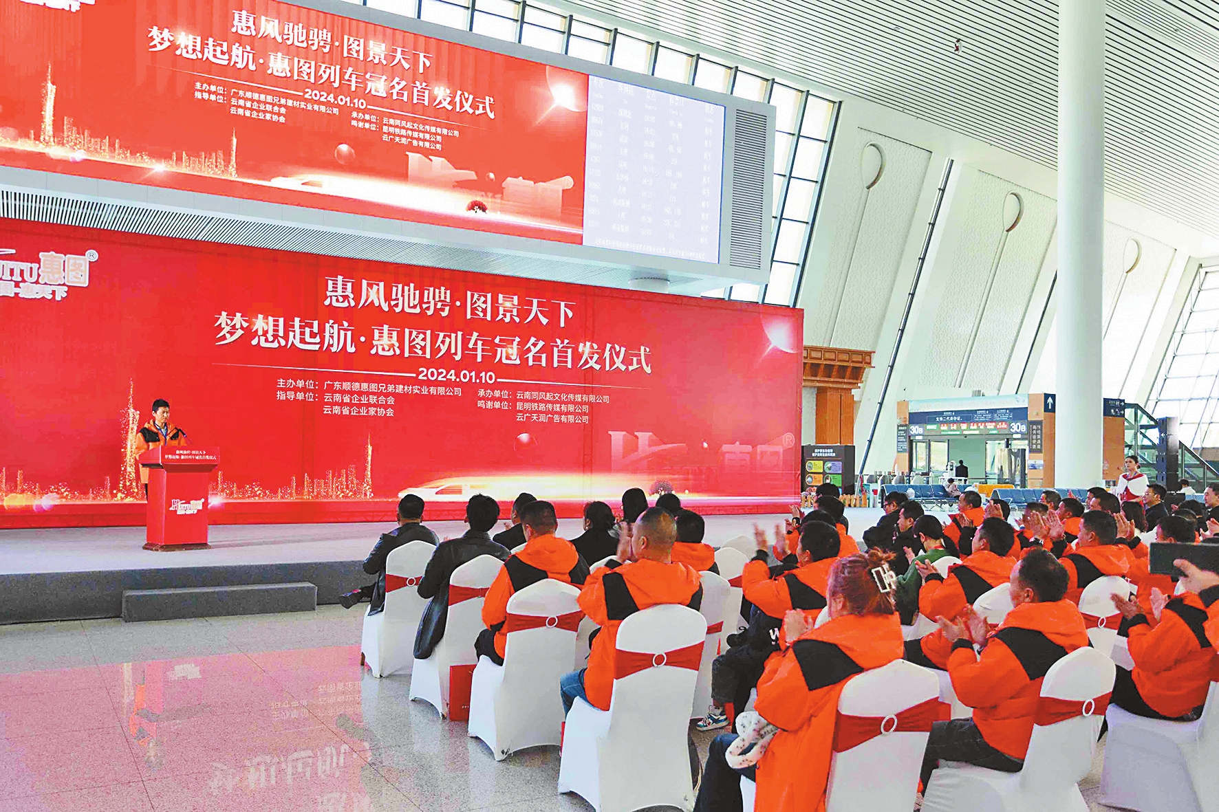 本报讯(记者 李向雄 熊明)近日,首列“惠图仿石漆”冠名高铁列车从昆明站发车。未来一年内,昆明至磨憨这趟高铁列车将成为广东顺德惠图兄弟建材实业有限公司宣传品牌知名度、美誉度的移动名片,这也是公司擘画南亚东南亚发展蓝图的又一举措。