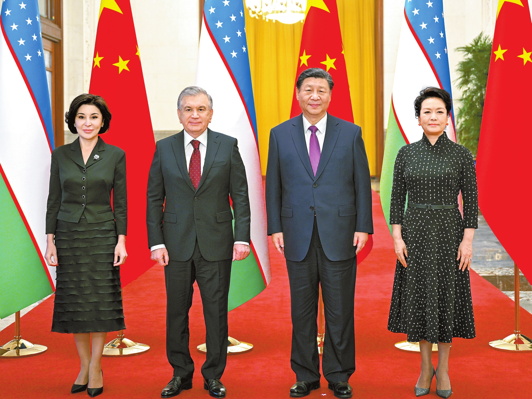 会谈前,习近平和夫人彭丽媛在人民大会堂北大厅为米尔济约耶夫和夫人米尔济约耶娃举行欢迎仪式。
