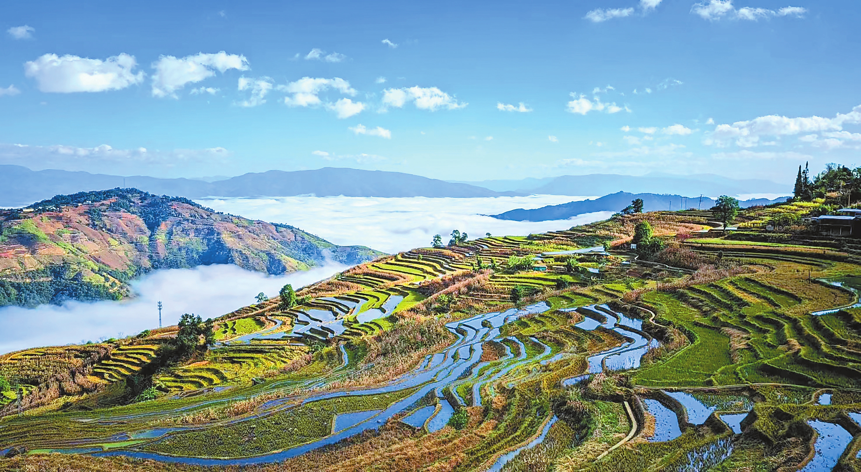 灌满水的梯田如镜,把聚散之浮云与澄澈之蓝天全部揽入怀中,云海翻涌,光影变幻。倾泻的阳光好似一双大手,悄然揭开梯田的白雾面纱,霎那间红霞满天、云雾翻涌,绝美的日出景观便呈现在眼前。等到太阳完全升起,梯田波光粼粼,金灿灿、亮闪闪,哈尼山寨披上金色的蓑衣。