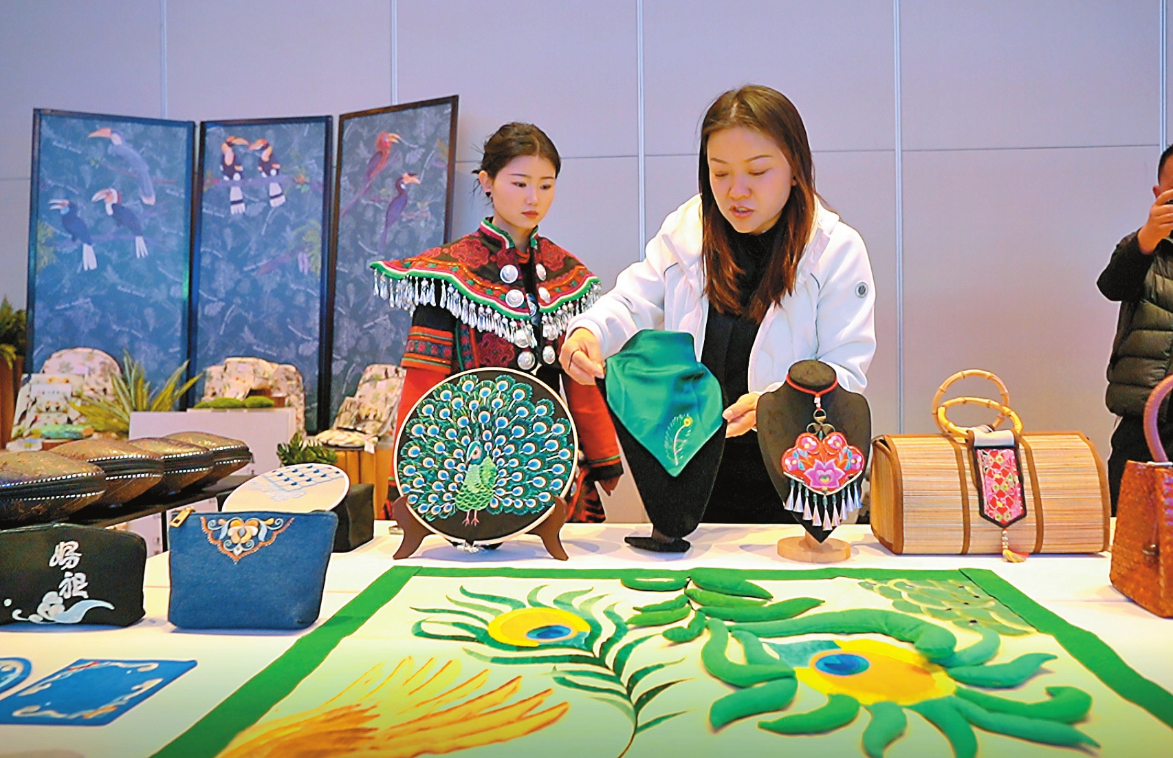 “每一件都是艺术品,让我对生活在云南的彝族和他们的文化充满好奇。”展位前,柬埔寨留学生春涵和她的朋友们对精美的彝绣产品频频点赞。