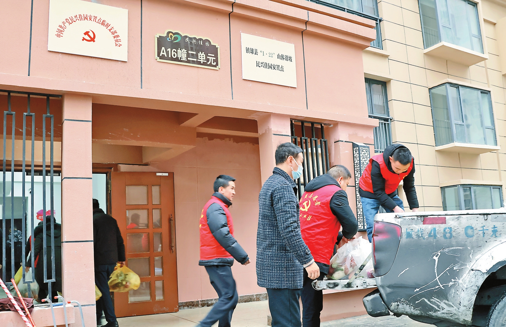在民兴佳园小区某单元入口处,“镇雄县‘1·22’山体滑坡民兴佳园安置点”“中国共产党民兴佳园安置点临时支部委员会”两块牌子十分醒目。
