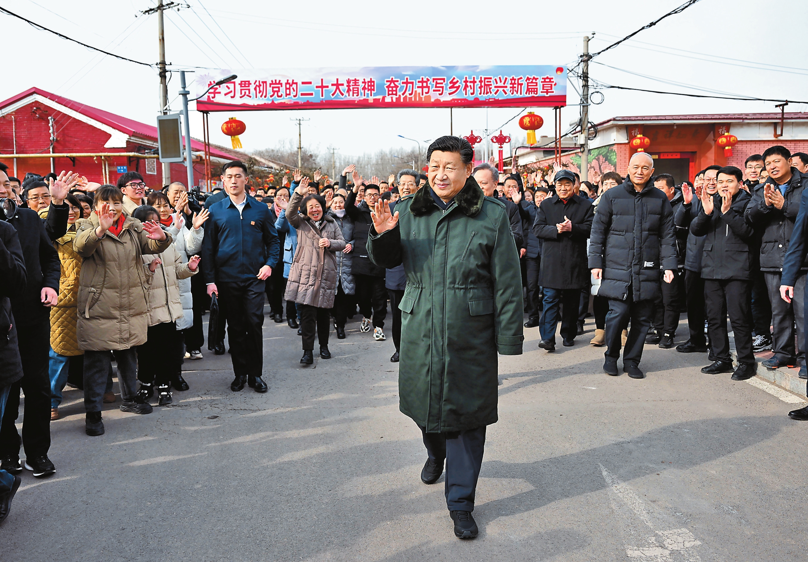 2月1日至2日,中共中央总书记、国家主席、中央军委主席习近平来到天津,看望慰问基层干部群众。这是1日上午,习近平在西青区辛口镇第六埠村考察时,向村民们挥手致意。新华社记者 谢环驰 摄