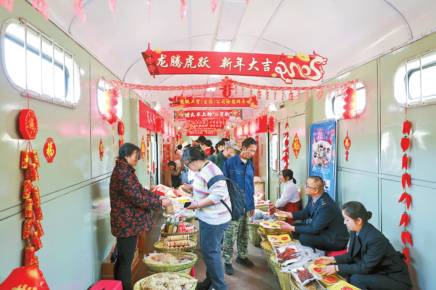 “临近春节,为方便沿线村民购买年货,7466/5次公益‘慢火车’首次开办年货街。”国铁昆明铁路工贸公司经理谢连华介绍,结合沿线村民需求,公司精选出200多种品质高、价格低的年货和土特产,以全场5折的价格销售,方便沿线村民采购到物美价廉的年货。