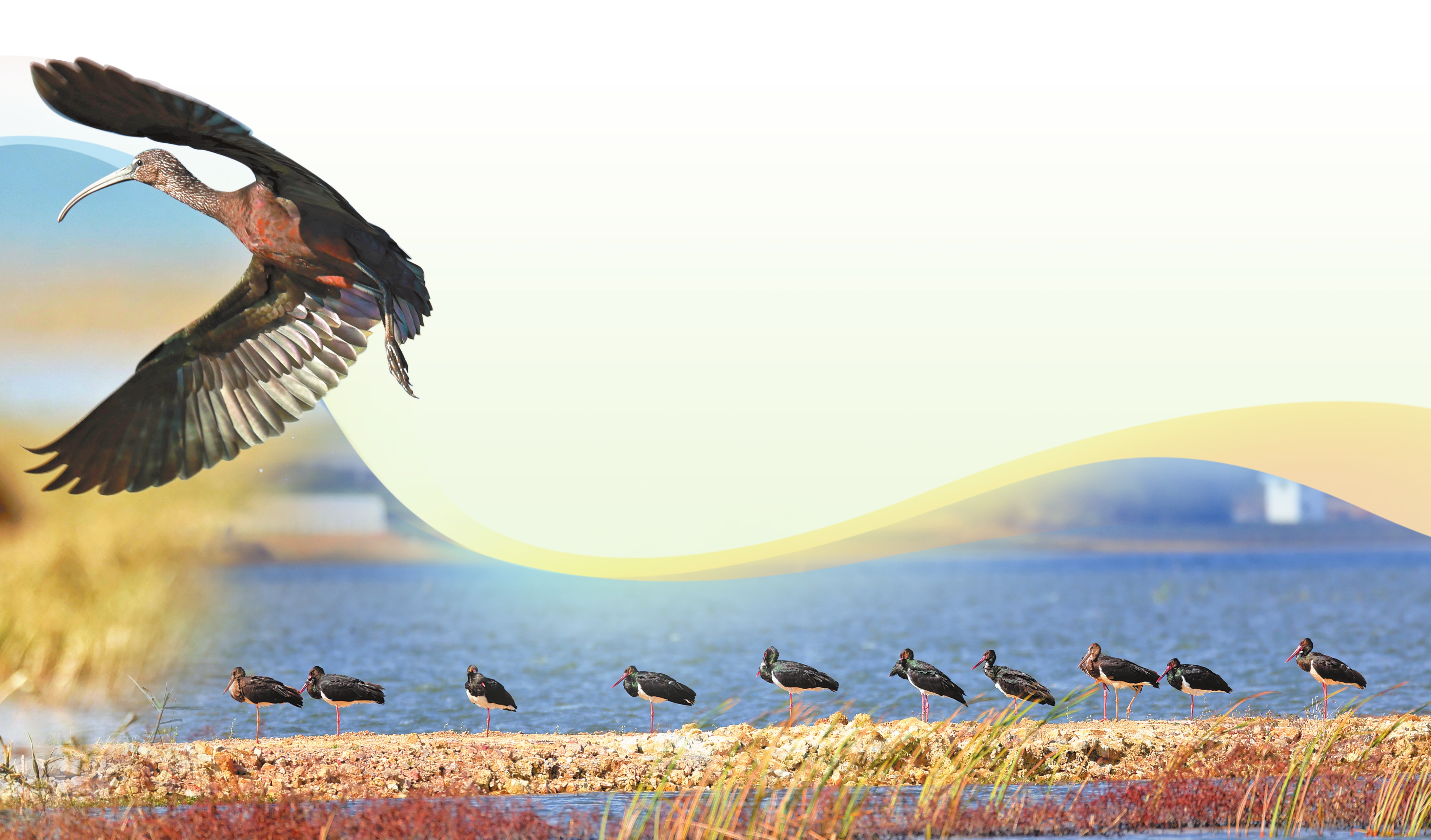 每年冬天,蒙自市长桥海湿地都会迎来一批批候鸟越冬栖息。近期,国家一级重点保护野生鸟类黑鹳和彩鹮也飞抵长桥海湿地。碧波荡漾的水面上,一群群野鸟或悠闲嬉戏,或展翅高飞,成为长桥海湿地的一道亮丽风景。