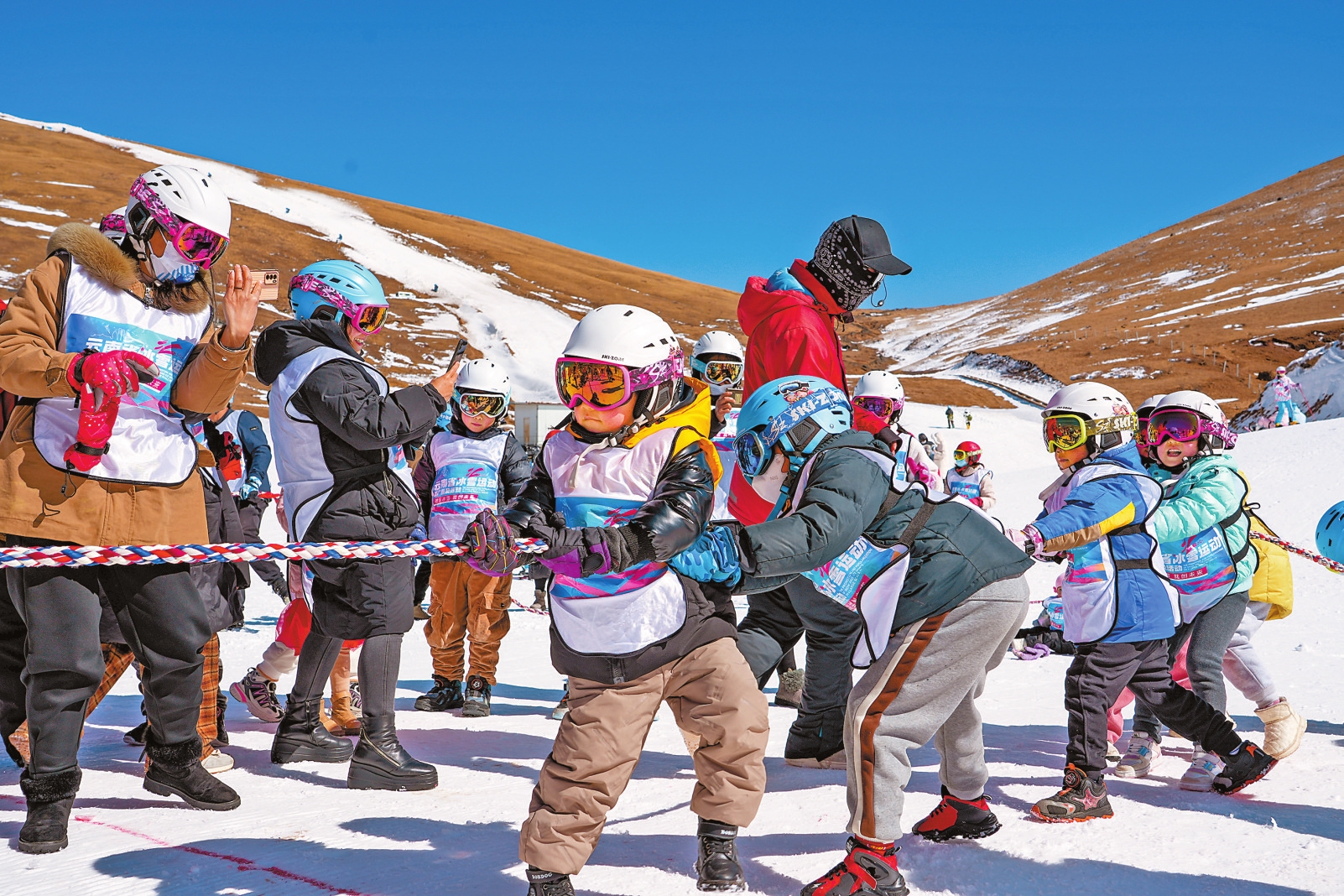 活动现场,社会体育指导员为学员讲解冰雪运动知识,开展双板滑雪实操教学。雪上拔河、雪地竞速投球、陆地冰壶游戏,专业滑雪装备、冰雪运动健儿的风采展示等吸引了众多爱好者参与。