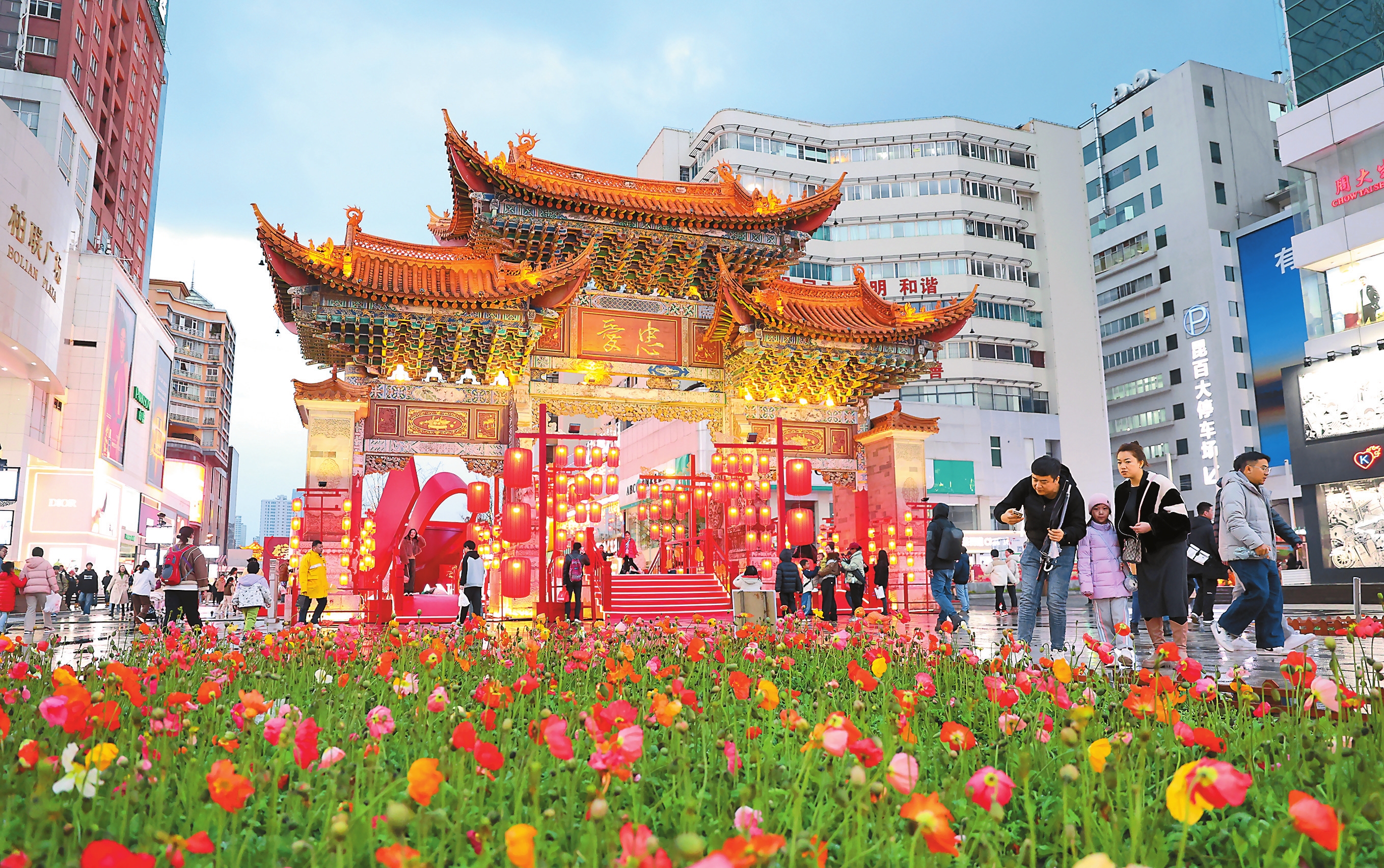 春节临近,年味渐浓。昆明市主城区的主要道路、广场、步行街等核心区域以及公园、车站等场所设置了立体花坛、花墙、花架等,鲜花扮靓城市,盛装喜迎佳节。
