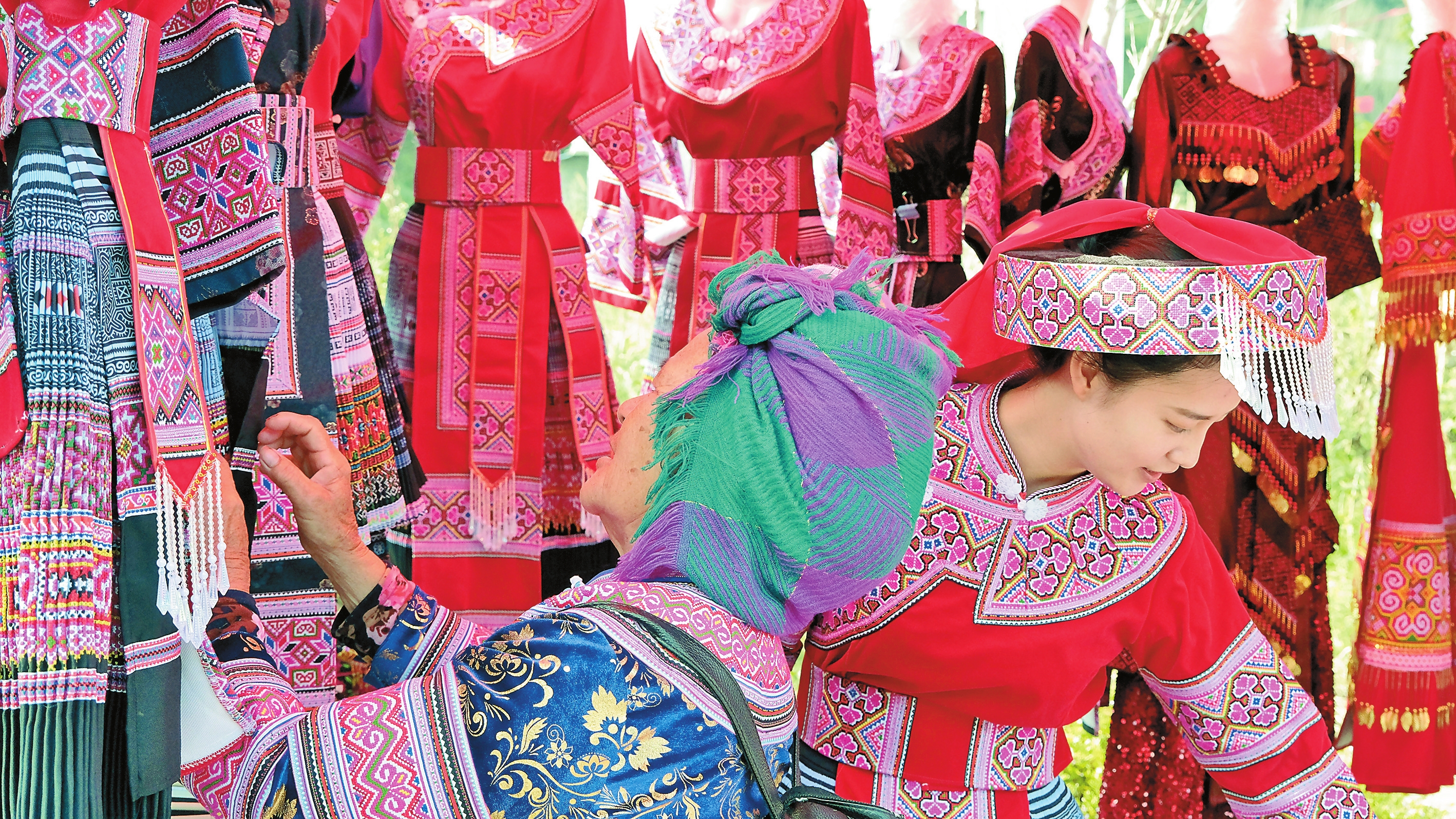 临近春节,位于中越边境的麻栗坡县猛硐瑶族乡集镇人头攒动,热闹非凡。街头巷尾的服装店比往日更加热闹,临时搭建的服饰摊位一眼望不到头,瑶族、苗族、壮族等各民族服饰琳琅满目,吸引男女老少驻足挑选。本报记者 张文峰 摄