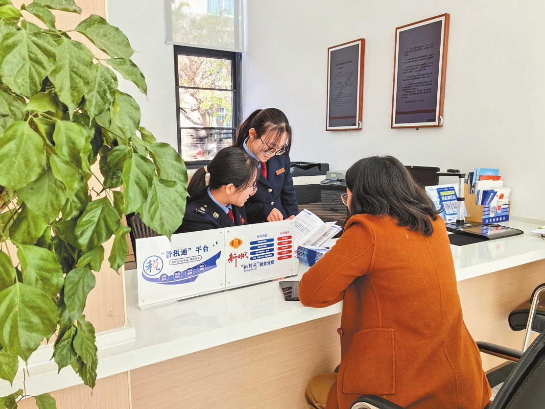 2024年新年伊始,晋宁区税务局推出了“新办纳税人礼包”,包含办税日历、税种申报温馨提示、最新税收优惠宣传册等。云南墨梵石业有限公司的财务人员翻看着礼包感叹:“这也太齐全了,开票流程写得清清楚楚,还可以扫二维码观看操作,最新的税收优惠政策也有,以后报税省时省力了。”
