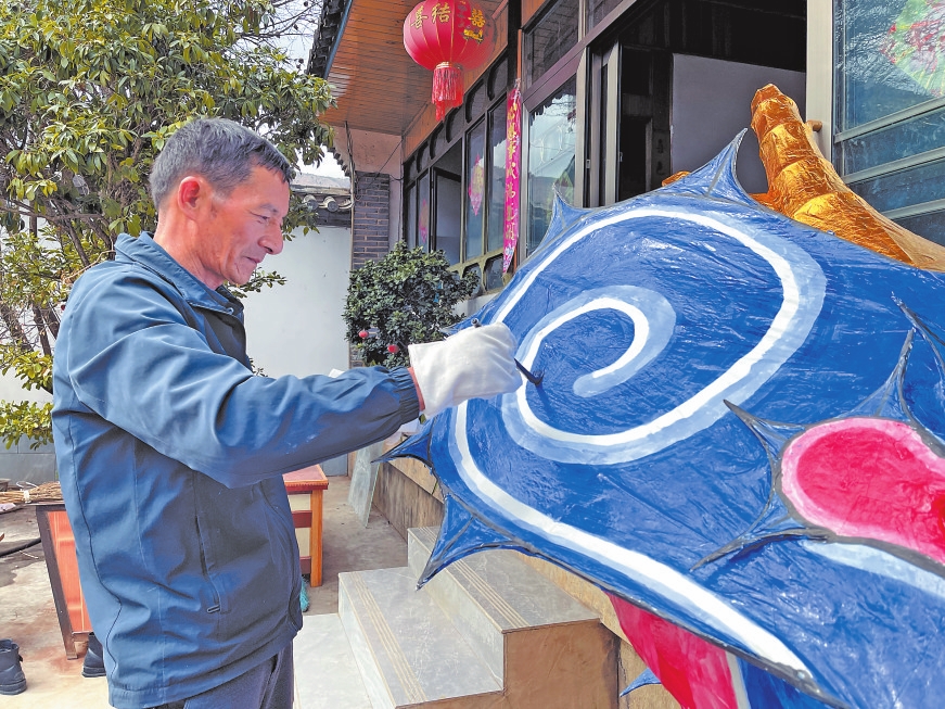 在杨金龙家的院子里,记者看到已经制作成型的龙头、龙身、龙衣、龙尾,每个部件都栩栩如生,杨金龙正在专心致志地给龙灯上色。他从小就对制作龙灯情有独钟,12岁开始就给外公打下手制作龙灯,17岁时已经能够得心应手地制作一整套龙灯。